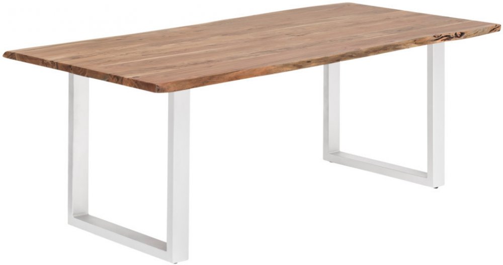 Přírodní okraj stromu na dlouhých stranách stolu. Krásně zrnité akátové dřevo v šedém odstínu. Nápadné bíle lakované kovové lišty s nastavitelnými plastovými nožičkami pro vyrovnání podlahy.