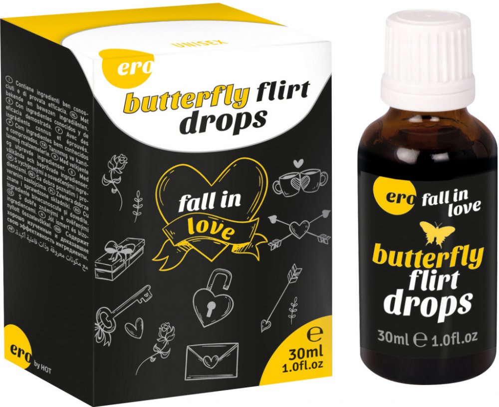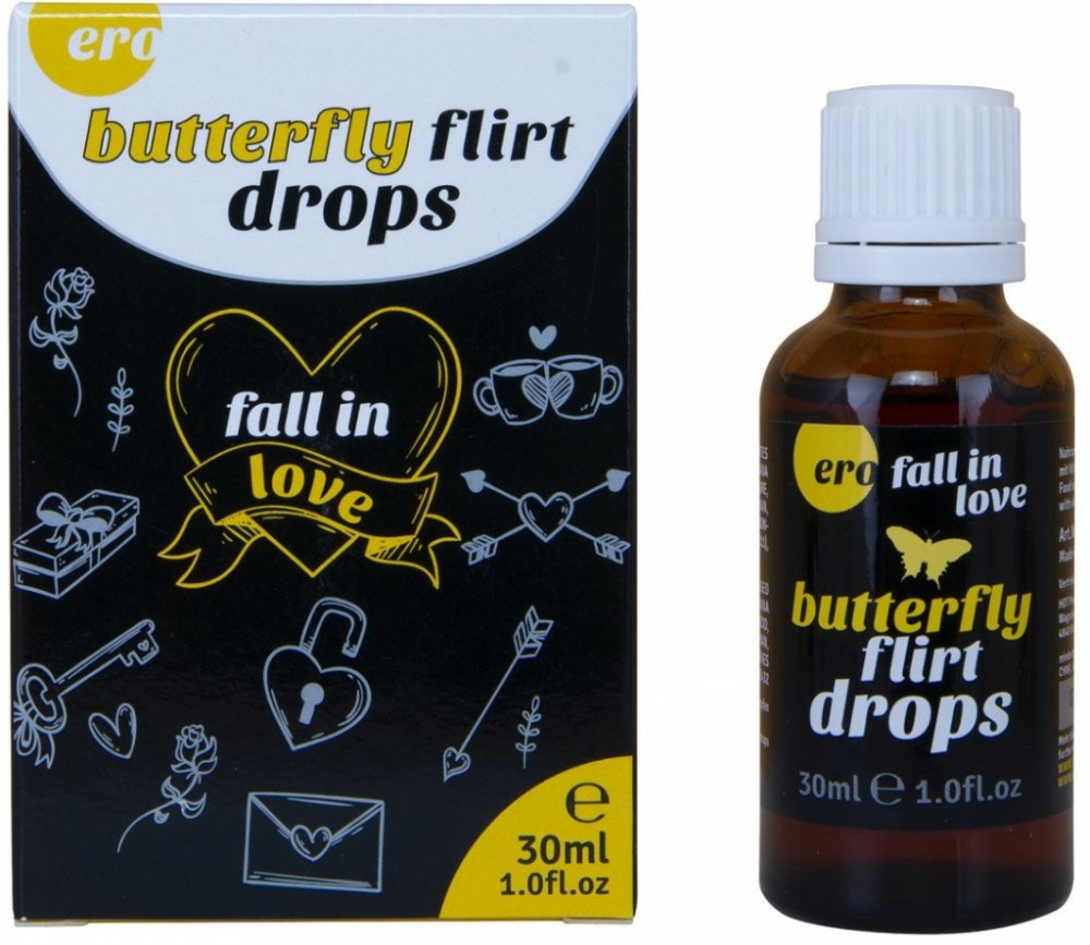 Afrodiziakální kapky pro ženy i muže Butterfly Flirt Drops obsahují známé přísady, které pomáhají zvýšit libido a zlepšit prokrvování intimních partií, např. damiánu a L-Arginin. UPOZORNĚNÍ: Nepřekračujte doporučené denní dávkování. Neužívejte jako náhradu pestré a vyvážené stravy a zdravého životního stylu. Pokud užíváte nějaké léky či doplňky stravy nebo jste přecitlivělí na některou z obsažených látek, poraďte se o vhodnosti užívání přípravku s lékařem. Uchovávejte mimo dosah dětí a domácích zvířat. Skladujte při běžné pokojové teplotě. Obsah: 30 ml Balení: skleněná lahvička Dávkování: 2x denně 30 kapek (cca 4 ml). Před použitím protřepejte. Mírné zakalení není na závadu. Složení: Demineralised Water, Ethanol, Damiana Leaf Extract, L-Ascorbic Acid, L-Arginine, L-Tryptophan, Acidifier E270, Preservatives (E202, E211), Emulsifiers E432 Skladování: Uchovávejte na suchém a chladném místě. Chraňte před slunečním světlem. Výrobce: HOT PRODUCTS (Německo)