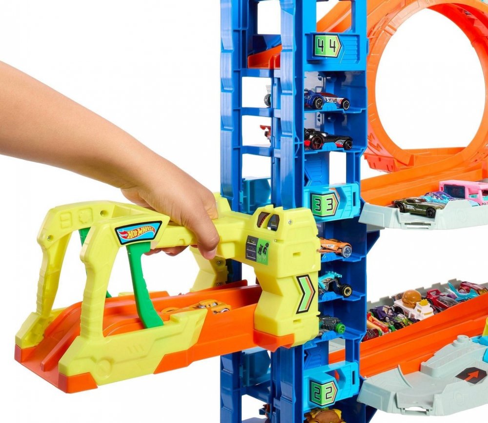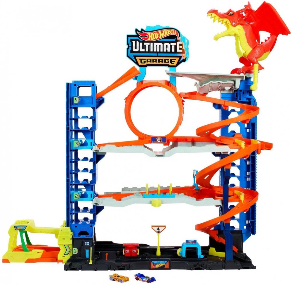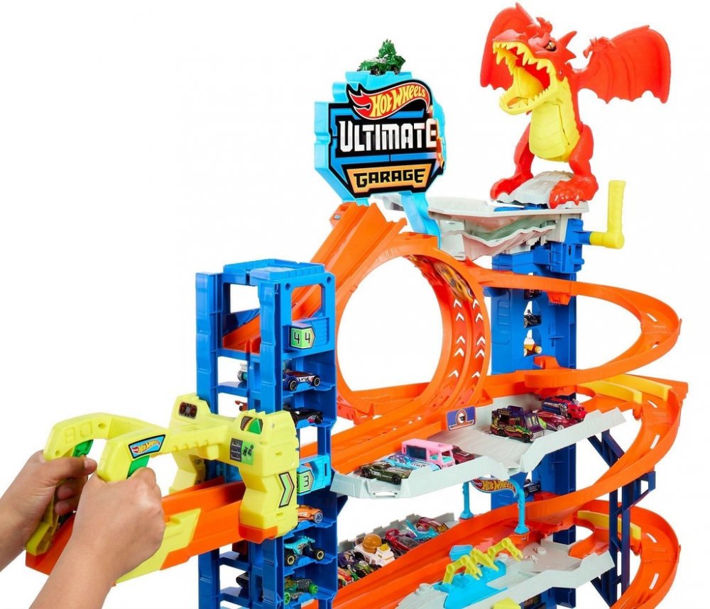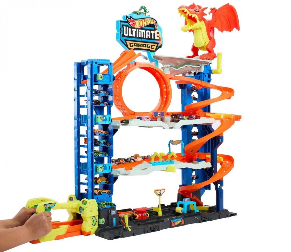 Tato působivá čtyřpatrová stavba je připravena na to, aby uspokojila nejdivočejší fantazie všech milovníků autíček. Je vybavená výtahem s funkcí odpalování pro dva angličáky i konektory pro připojení k dalším samostatně prodávaným setům Hot Wheels. V prvním patře se rozprostírá herní zóna plná zábavy. Najdete tam třeba myčku s pěnovými válci nebo benzínovou stanici. Ve druhém patře na vás čeká dvojitá závodní dráha, na kterou můžete autíčka vystřelit přímo z výtahu. Ve třetím patře se otevírá smyčka s pohyblivými závorami, které umožňují přizpůsobit si dráhu dle přání. Ve čtvrtém patře na souboj s vámi vyčkává děsivý drak. Pokud ho porazíte, spadne až na zem. Pokud vyhraje, autíčko sežere a pak vykaká! Barvy a provedení se mohou lišit.