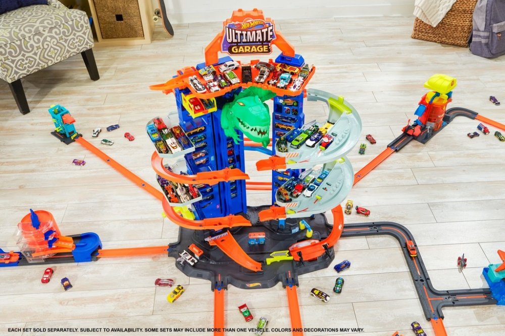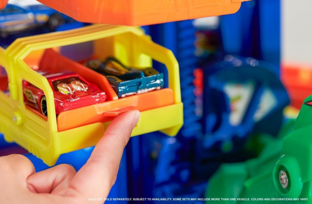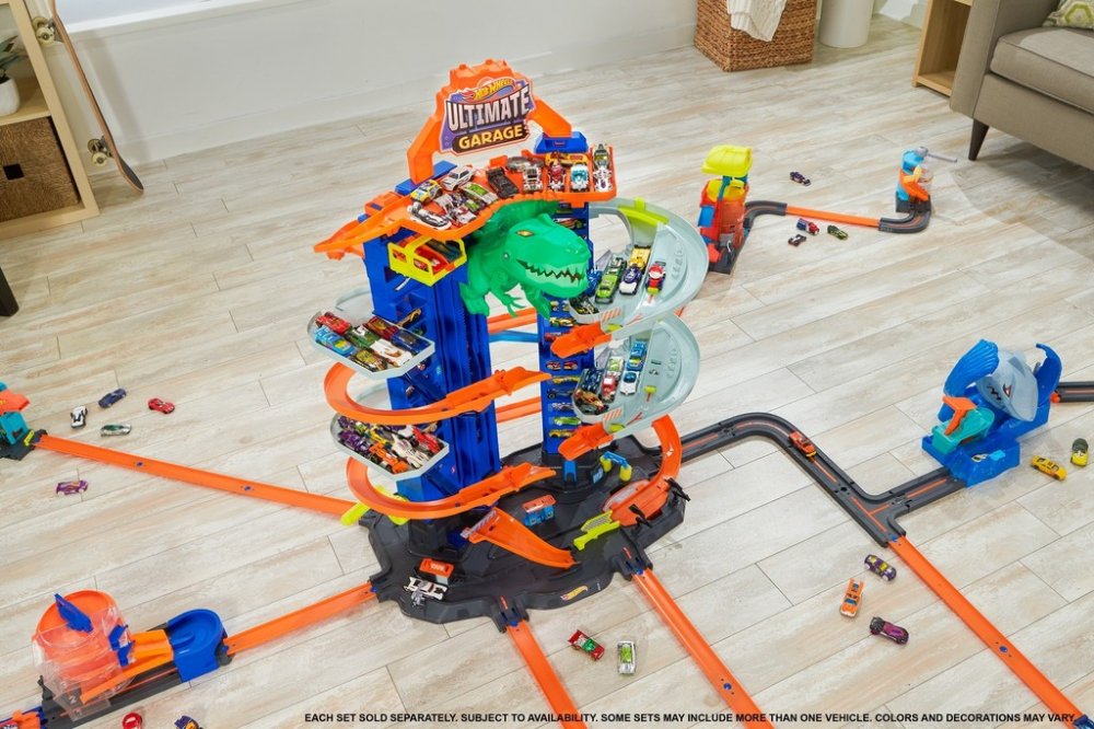 Užijte si nekonečné vyprávění příběhů a napínavou hru s autíčky! Obří herní sada skýtá prostor pro více než 100 autíček a nabízí překvapivou bitvu s robotickým T-Rexem, které podnítí dětskou představivost. Děti autíčka dopraví nahoru pomocí výtahu pro dvě vozidla, který samy pohánějí. Při sjíždění vícepatrovou garáží mohou závodit a vyzkoušet režim pro více hráčů, ve kterém si užijí ještě více záb...