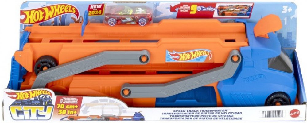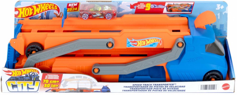 Naložte na velký náklaďák až devět autíček Hot Wheels v měřítku 1:64 a vydejte se do Hot Wheels City, kde můžete podle libosti závodit a dělat kaskadérské triky. Rozložte návěs kamionu a odhalte závodní dráhu o délce více než 76 cm.
