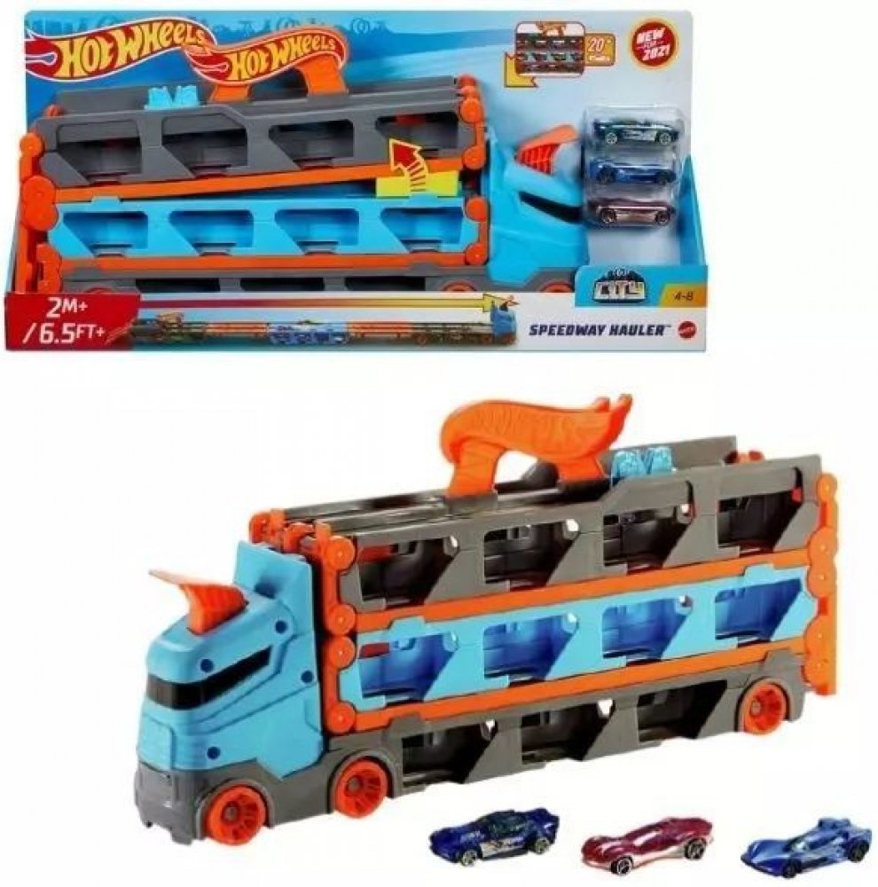 Kamion na přepravu autíček nebo závodní dráha? Ať je to obojí! Nový přepravní kamion Hot Wheels 2 v 1 je plný malých překvapení. Kamion může pojmout více než 20 autíček, která lze vidět skrz malá okénka. A pokud se otevřou převozní rampy, rozvine se závodní dráha se dvěma pruhy, měřící téměř 2 metry. Závodní autíčka lze vyslat na závod z kabiny kamionu, která se promění v odpalovací zařízení s nastavitelnou startovní čárou, kde mohou autíčka měřit rychlost a dovednosti, zatímco ostatní autíčka čekající na řadu mohou fandit ze spodního úložiště. Dráha může být připojena k dalším setům Hot Wheels City (prodávají se samostatně), kde dobrodružství s autíčky mohou pokračovat. Přepravní kamion 2 v 1 přichází se 3 autíčky, ale je vhodný pro přepravu více než 20 autíček.
