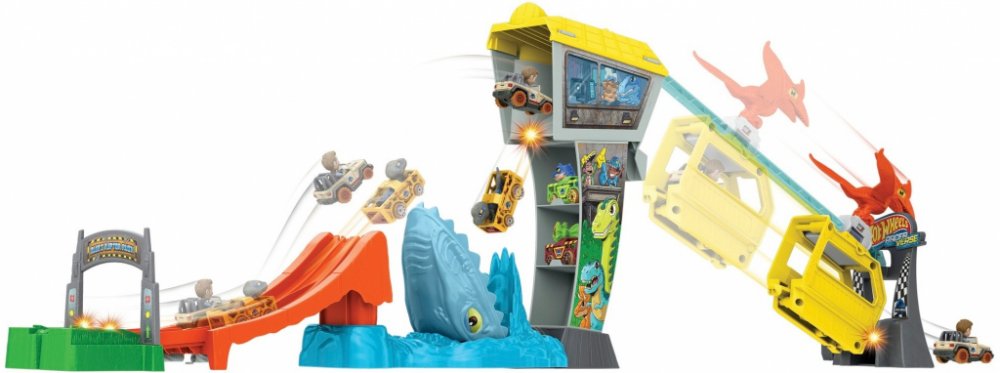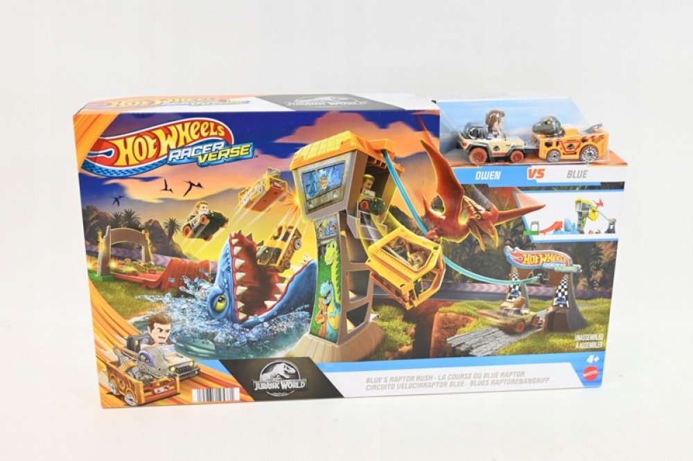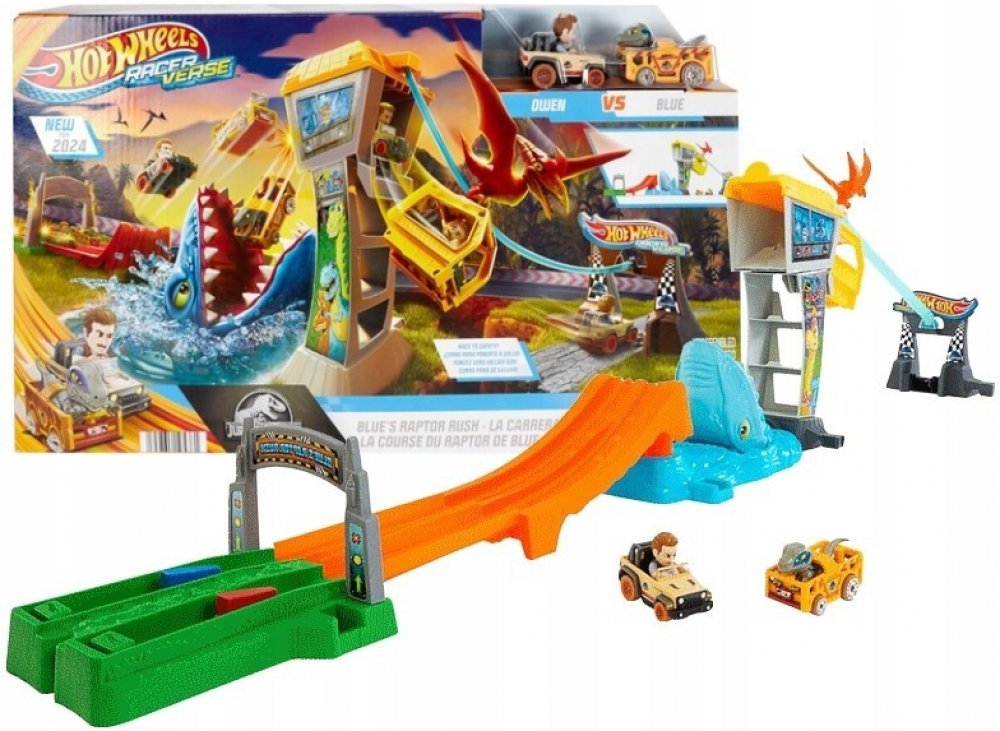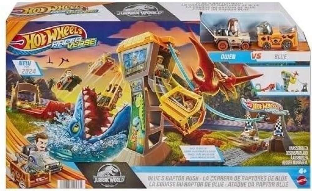 Hot Wheels RacerVerse Jurský svět Lanovka Blue Sada s dráhou a dvěma kovovými vozidly inspirovanými Blue a Owenem nbsp V této sadě Hot Wheels RacerVerse trade můžete závodit a projet se lanovkou v cíli,Zažívám emoce jako z filmu oacute v Jurském světě. Jsou tu dvě kovová vozidla Hot Wheels s nevyjímatelnými figurkami Raptora Blue a Owena za volantem, připravená vyrazit za dobrodružstvím. Kdo bude rychlejší, odpověď na tuto otázku je plná závodních zážitků, protože vítěz dorazí na strážní věž a pojede lanovkou přímo na bezpečnou půdu a poražený skončí v tlamě mozazaura. Sada se skládá z p oacute ł, což usnadňuje skladování. Barvy a dekorativní prvky se mohou výrazně oživit. Vozidla Hot Wheels RacerVerse s Blue a Owenem se poměřují v závodě, aby unikli z ostrova známého ze série Jurský svět. Startujte oběma autíčky současně, abyste zjistili, kdo oacute re dorazí do strážní věže jako první a uteče lanovkou, aby unikl nebezpečí. Smolný poražený spadne přímo do otevřené tlamy vyhladovělého mozazaura.