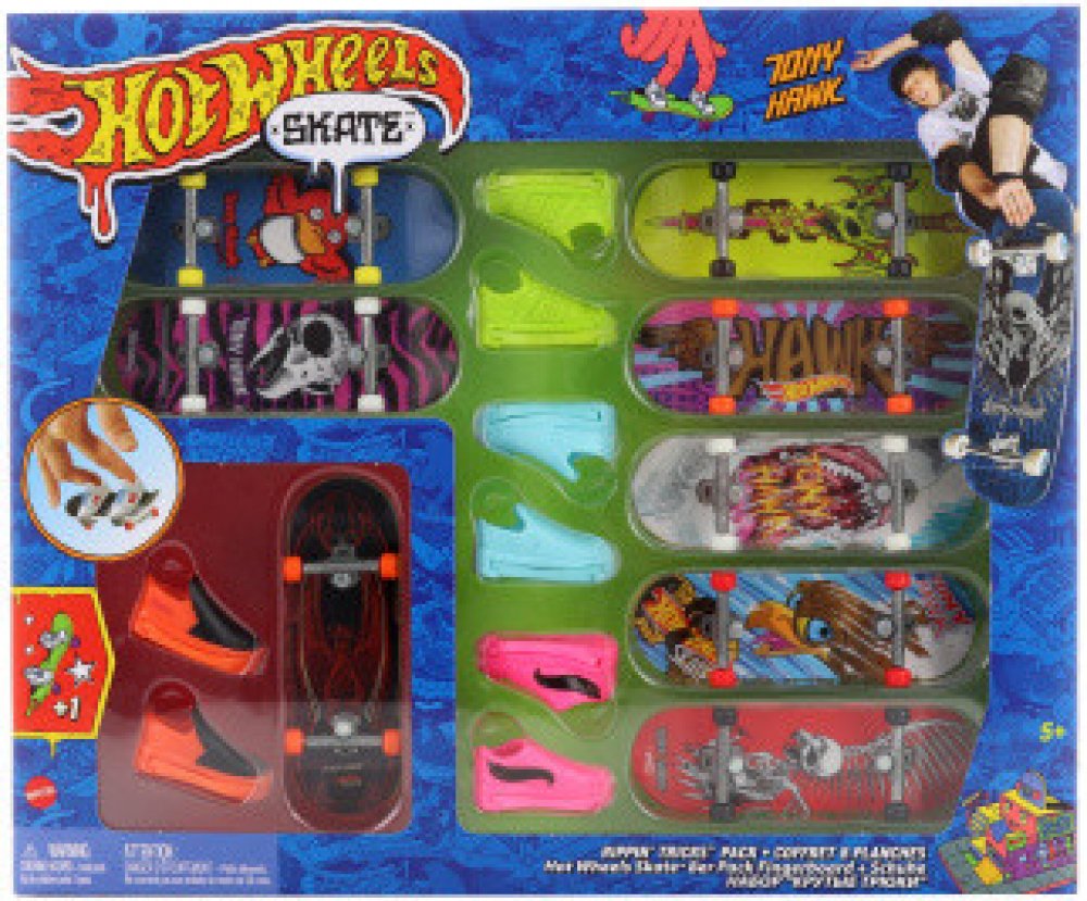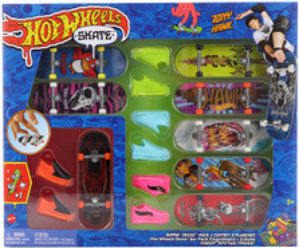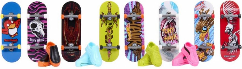 Předvádějte drsné skoky s tímto setem 8 ks fingerboardů a skate bot. Hot Wheels® a legenda skateboardingu Tony Hawk se spojily, aby vytvořily epickou kolekci fingerboardů, které vypadají skvěle při broušení railů a provádění ollies. Set obsahuje osm různých, úžasně stylizovaných a kompletně sestavených fingerboardů spolu se čtyřmi různými páry skate bot, které lze střídavě používat se všemi fingerboardy. Skate boty pomáhají dětem získat cit při zvládání kaskadérských kousků a salt. Barvy a vzhled výrobku se mohou lišit.