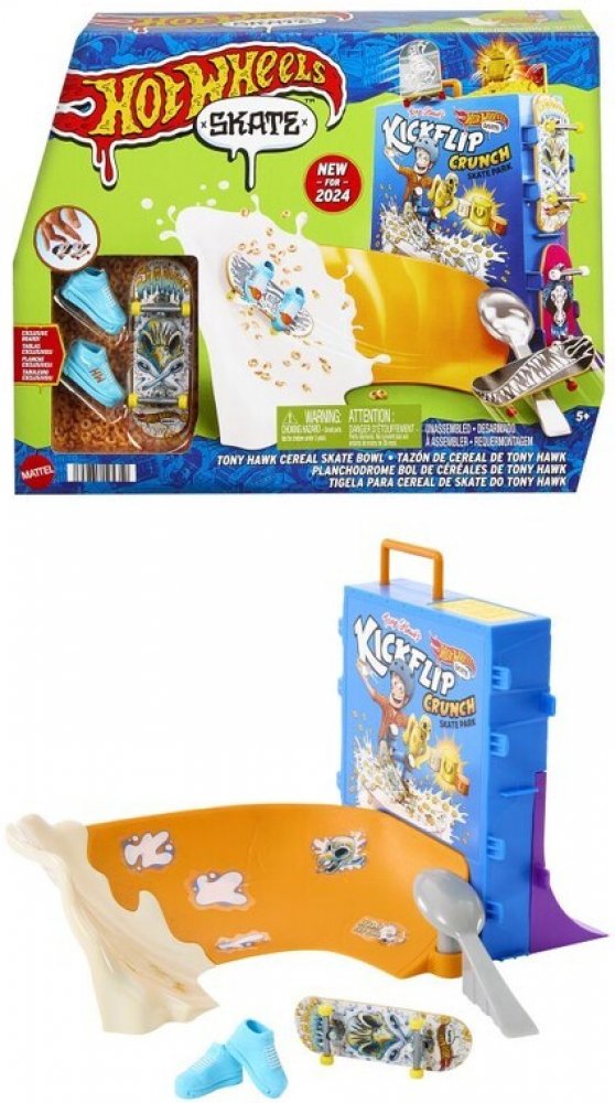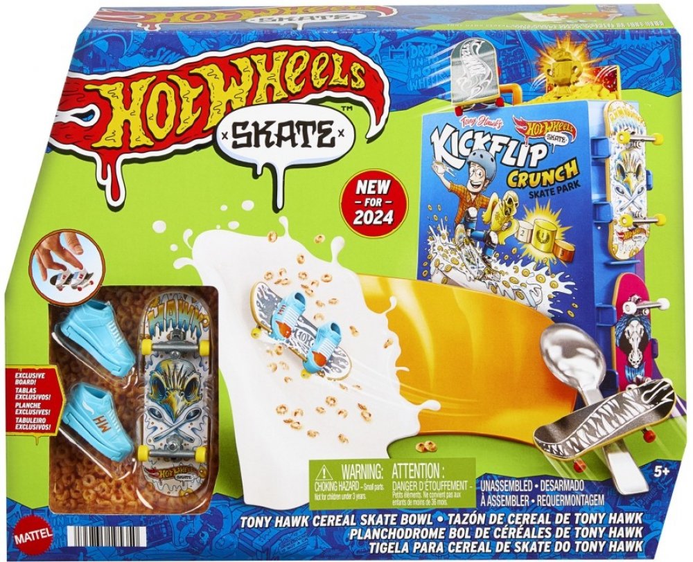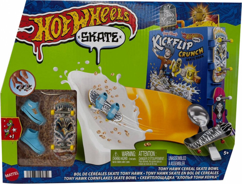 MATTEL - Hot Wheels Skates Cereáliový Fingerboard SkateparkS herním setem Hot Wheels® Cereáliový fingerboard skatepark se můžete prohánět po velkolepé misce s cereáliemi. Tento skate set s motivem cereálií, vytvořený ve spolupráci s legendou skateboardingu Tony Hawkem, vyzývá fingerboardisty, aby projeli miskou s cereáliemi, předváděli vertikální triky na krabici s cereáliemi a nahoře zabrousili n...