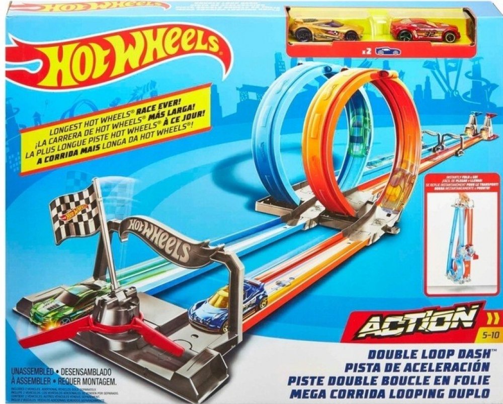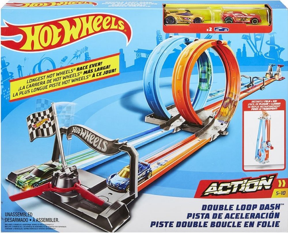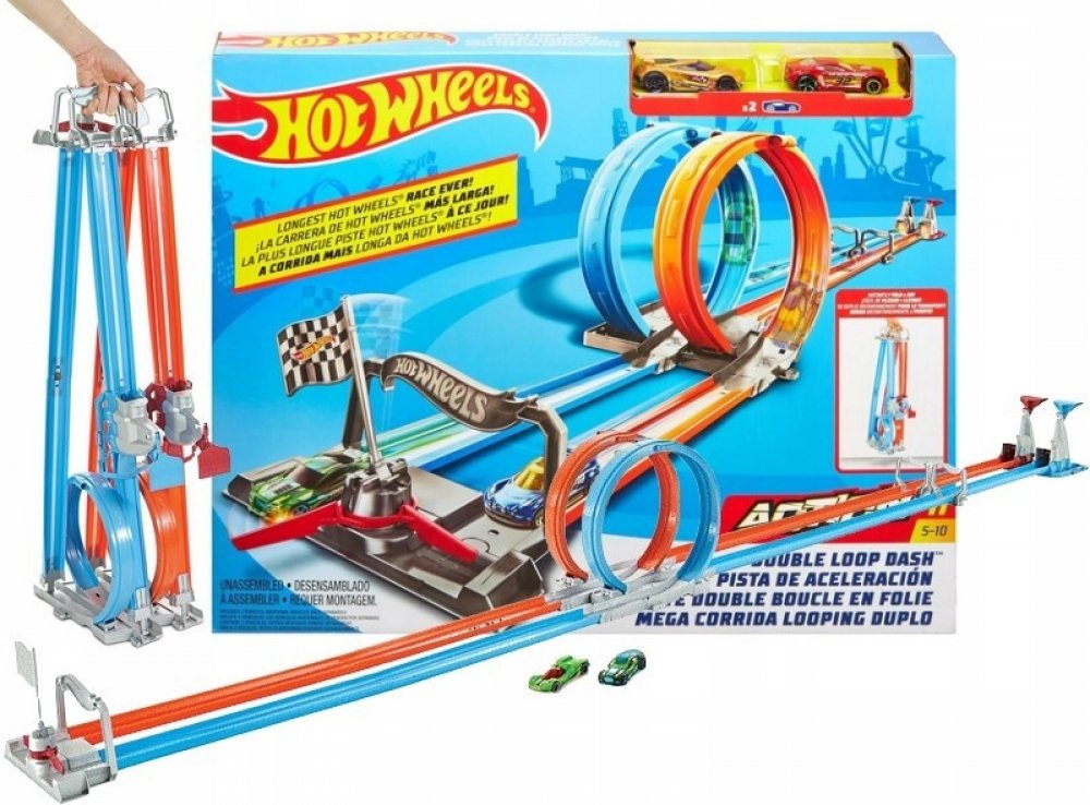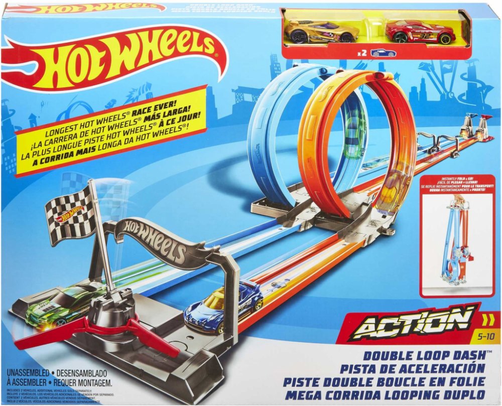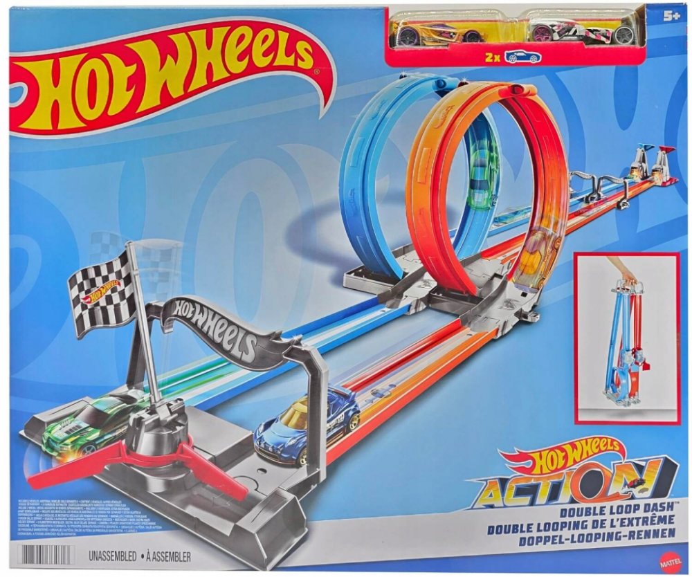 Odstartuj únikový závod na dvojité dráze Hot Wheels! Dokončete epickou smyčku, abyste co nejrychleji dorazili do cíle a aktivovali vlajku. Dráha je dlouhá 2 metry a skládá se v několika jednoduchých krocích pro snadné přenášení. Sadu lze sestavit i v režimu pro jednoho hráče s opravdu dlouhou rovinkou - až 4 metry trati. Skvělý dárek pro děti od 5 do 10 let.