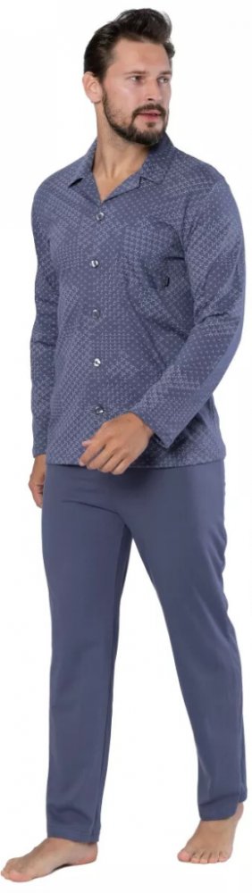 Pánské pyžamo Blazej 1682 HOTBERG je perfektní volbou pro muže, kteří hledají kombinaci pohodlí a stylu při odpočinku i spánku. Horní díl pyžama s dlouhým rukávem zdobí jemný vzor v modrém odstínu, který dodává decentní a moderní vzhled. Praktické zapínání na knoflíky a klasický límec zaručují snadné oblékání a elegantní celkový dojem.Kalhoty mají jednobarevný design, který ladí s vrškem, a jsou v...