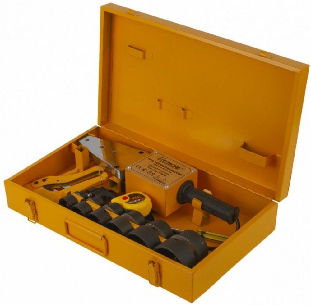 Praktická instalatérská sada v plechovém kufříku obsahuje polyfúzní svářečku o výkonu 1500W vybavenou termoregulátorem, 6 nástavců Ø 20, 25, 32, 40, 50 a 63 mm, stojan, nůžky na plastové trubky, pracovní rukavice a další příslušenství.
