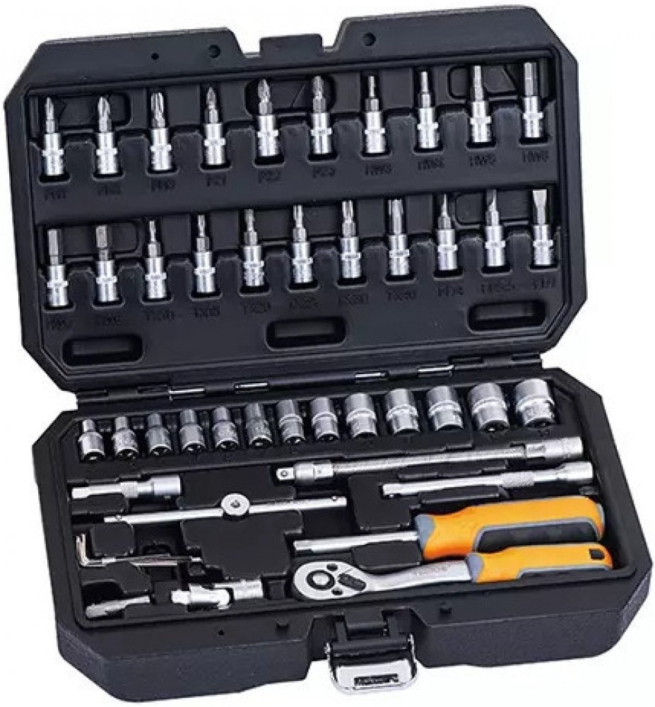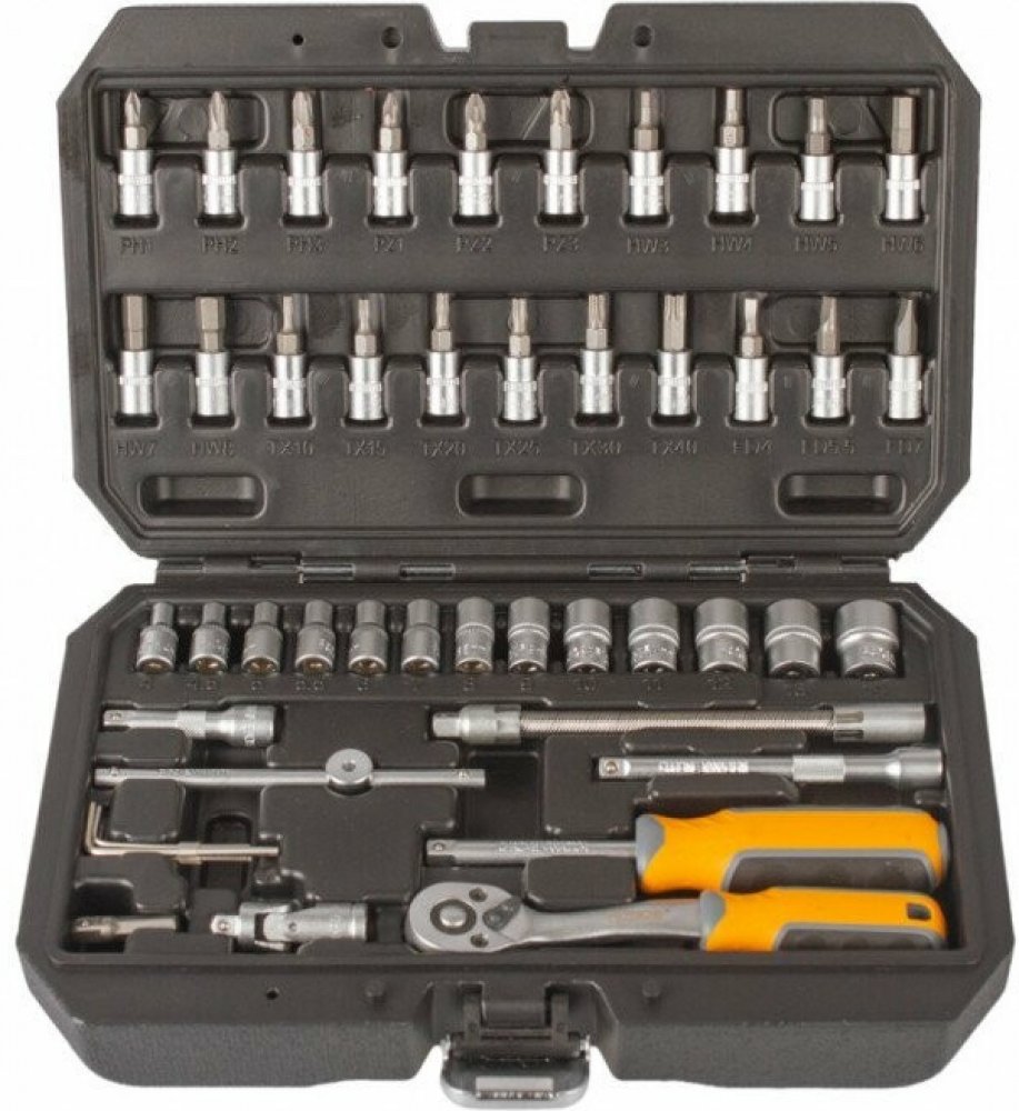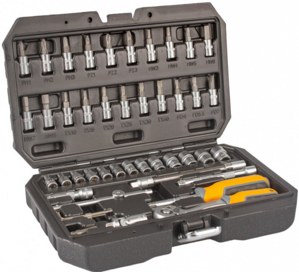 Gola sada s ráčnou 1/4" v praktickém plastovém kufříku, díky kterému sadu snadno přenesete. Díky ergonomickému tvaru rukojeti padne ráčna se šroubovákem dobře do ruky a docílíte tak pevnějšího úchopu. Rukojeť je navíc vyrobena z protiskluzových materiálů (kombinace plastu a gumy).