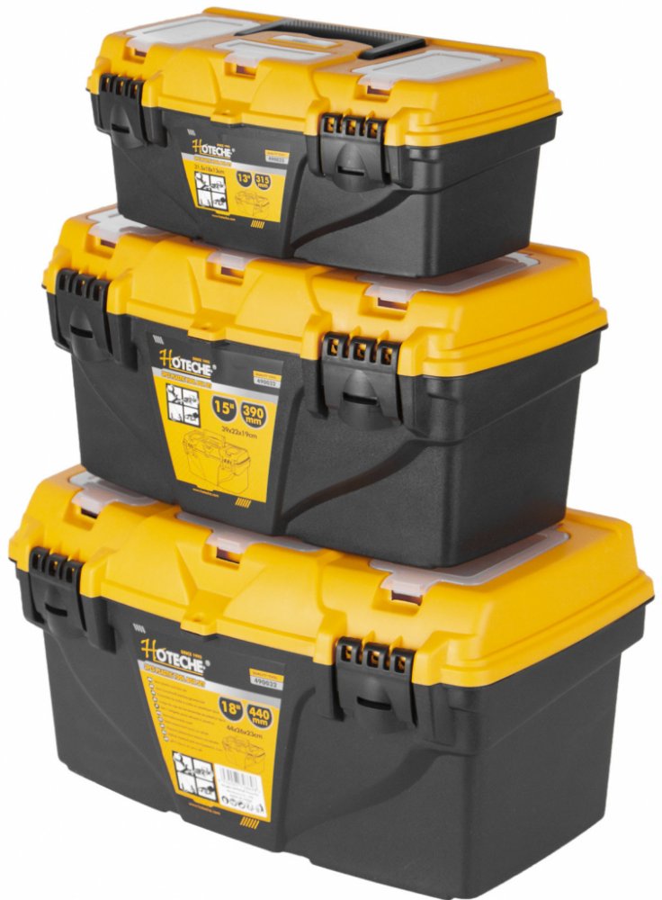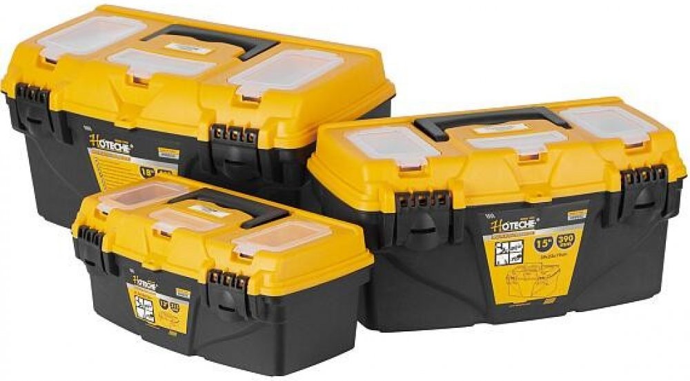 V horní části kufrů se nachází madlo pro pohodlné přenášení, ale také další úložný prostor např. pro šroubky nebo matice v podobě průhledných uzavíratelných přihrádek.