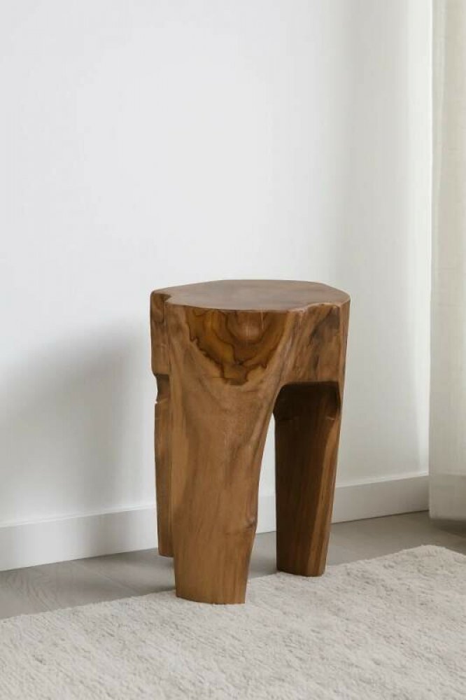 V obývacím pokoji jako vedlejší stolek k sedací soupravě – přirozený teak dodá prostoru teplo a materiálovou hloubku.