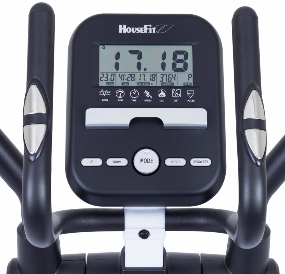 Trenažéry značky HOUSEFIT MOTIO 50 patří na českém trhu k nejprodávanějším v kategorii domácích eliptických trenažérů. Nabízí zákazníkům kombinaci vynikající mechaniky a ergonomie rámu za přijatelnou cenu. Ojedinělá rámová konstrukce s délkou kroku 40 cm a vzdálenosti pedálů 20 cm zaručuje pohodlný a správný pohyb drobným lidem, ale i osobám s výškou až 200 cm. Velmi užitečná je i možnost naklonění pevných rukojetí. Kvalitní součástky, masivní a stabilní konstrukce jsou zárukou dlouhé životnosti tohoto trenažéru. Lze jej proto využít i pro pravidelný kondiční trénink. Vyvážený setrvačník a rotující masa 19 kg zajišťuje plynulý a tichý chod i při větších zátěžích, osobám do hmotnosti 150 kg. V místě napojení pedálů na setrvačník je kyvné uložení ložiska pro minimální poruchovost. Magnetická brzda je ovládaná manuálně otočným regulátorem se stupnicí 1-8. Nehlučný chod a dlouhou životnost, zajišťuje stroji 16 průmyslových ložisek osazených v pohyblivých spojích, středovém složení a na ose setrvačníku. Přehledný a snadno ovladatelný computer je vybaven LCD monitorem se snadným a přehledným ovládáním. Zobrazuje všechny běžné hodnoty jako čas, rychlost, vzdálenost, spálené kalorie a hodnotu tepové frekvence, měřené pomocí senzorů v rukojetích. Počítač je vybaven systémem RECOVERY, který umí vyhodnotit v tzv. zklidňovací fázi po cvičení váš fyzický stav, měřený v závislosti na rychlosti poklesu tepové frekvence bezprostředně po dokončení tréninku.