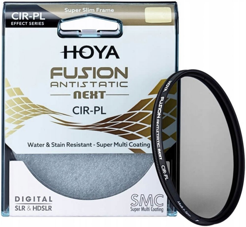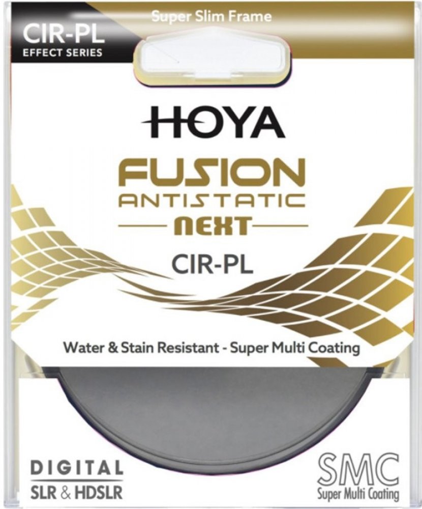 HOYA CIR-PL FUSION Antistatic Next je polarizační filtr s 16 antireflexními vrstvami a oboustranou antistatickou povrchovou úpravou, která se okolo filtru chová jako silové pole a odpuzuje prachové částice. Poslední tvrzená antistatická vrstva odpuzuje vodu, prachové částice a je odolná vůči nečistotám. Filtr FUSION Antistatic Next tak vyžaduje méně časté čištění od různých skvrn a otisků prstů.