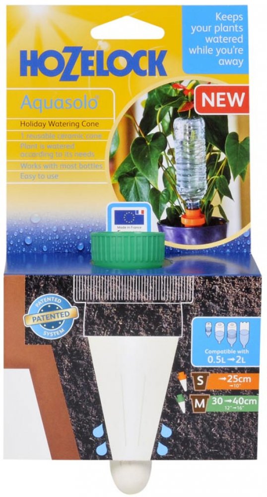 Aquasolo je jednoduchý zavlažovací systém, který lze použít pro hrnkové rostliny kolem vašeho domova. AQUASOLO Medium Green, označení Medium označuje průtok vody. Řídí se pórovitostí keramiky v kuželu:Zelená = 20 cl/den AQUASOLO Keramický zavlažovač květin na PET lahev - K opakovanému použití - Kompatibilní s většinou typů lahví (0,5 – 2 l) INSTRUKCE - Vyberte typ zavlažovače dle velikosti květináče - Průtok závisí na zvolené barvě zavlažovače. Řídí se pórovitostí keramiky v kuželu - Oranžová = 7 cl/den Zelená = 20 cl/den - Vyberte velikost láhve dle požadované doby trvání zalévání - Naplňte lahev vodou, případně přidejte výživu – tekuté hnojivo - Našroubujte lahev na zavlažovač s nebo bez použití adaptéru - Propíchněte špendlíkem dno láhve k zajištění toku vody - Před vložením zavlažovače dostatečně rostlinu zalijte - Vhodné pro vnitřní i venkovní použití (ne však při možnosti zamrznutí) DOBA ZAVLAŽOVÁNÍ Doporučení jsou pouze orientační, založena na průměrných podmínkách. Příjem vody se může lišit v závislosti na kvalitě půdy, vlhkosti v místnosti a aktuálních podmínkách, jako je teplota či vystavení slunci nebo větru. ÚDRŽBA Zkontrolujte zda neprolíná vodo kolem závitu, voda by měla unikat pouze skrze stěny kužele. Chcete-li zajistit optimální výkon a dlouhou životnost vašeho zavlažovače , vyjměte kužel každých několik měsíců a namočte do roztoku octa, očistěte a opláchněte v čisté vodě. Používejte pouze plně zředěné tekuté výživy v láhvi s vodou, aby se v zavlažovači neucpaly póry.