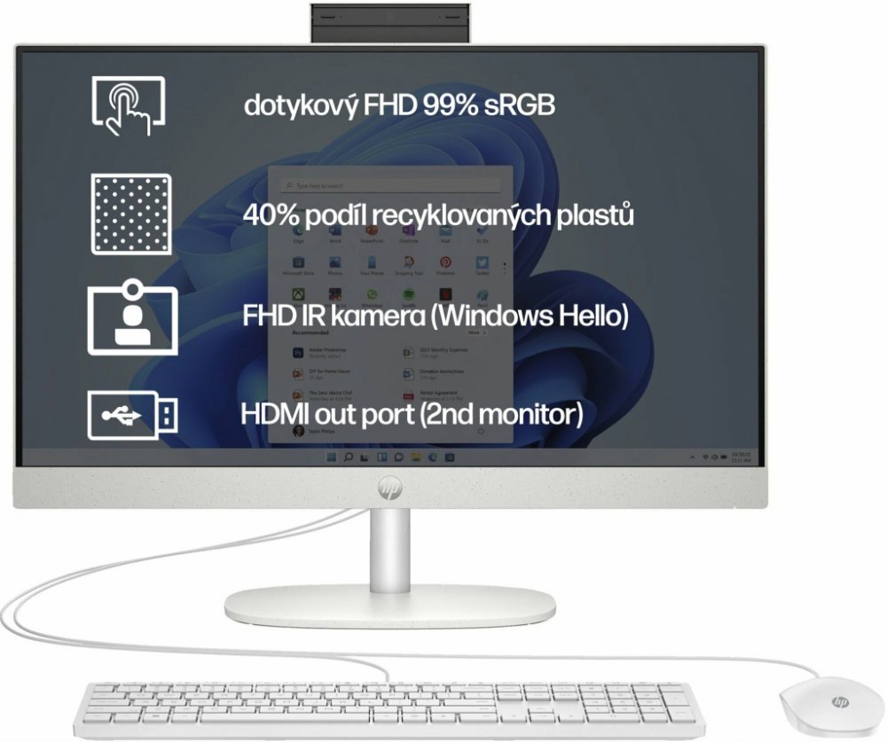 All In One PC je prostorově nenáročnou variantou počítače, monitor totiž skrývá všechny komponenty, mimo ušetřeného místa také nabízí snadnou instalaci bez spleti kabelů. Model HP 24-cr1006nc White má ve své výbavě dotykový monitor s úhlopříčkou 23,8" a nabídne vám sílu a rychlost Rozlišení displeje je běžné Full HD s jemností pro sledování filmů i pro práci. Použitá technologie dodává obrazovce solidní pozorovací úhly a kvalitní barvy. Oblíbenou vlastností All In One PC HP je možnost využití WiFi připojení, nebude tak zapotřebí přivádět k počítači kabel. Instalován je systém Windows 11 Home. Součástí All In One PC HP 24-cr1006nc White je klávesnice s myší, ihned po rozbalení tedy můžete začít pracovat. Nejdůležitější vlastnosti All In One PC HP 24-cr1006nc White Kompaktní konstrukce s hardwarem v monitoru Rychlý SSD disk poslouží kapacitou 1000 GB All In One PC HP má instalovánu operační paměť 32 GB Perfektní obraz budete mít díky monitoru s 23,8" IPS displejem Efektivní ovládání díky dotykovému displeji...