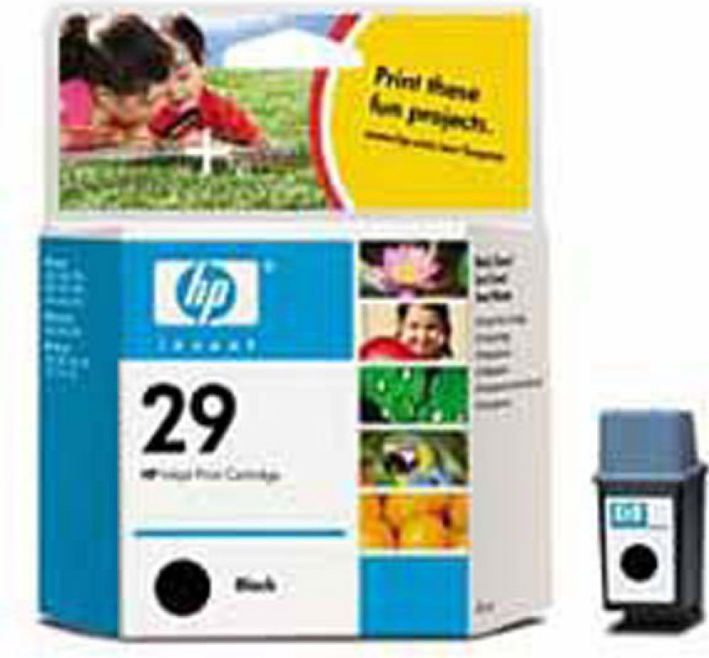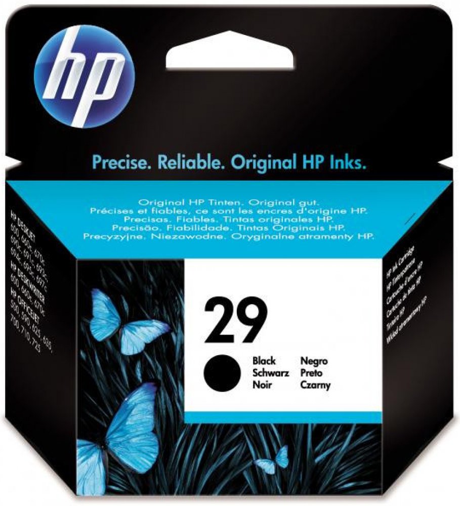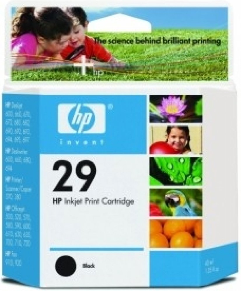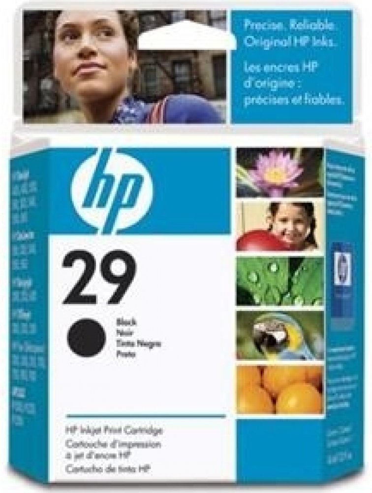 Černá inkoustová tisková kazeta HP 29 (51629A) se svým moderním designem tiskové hlavy a pokrokovou technologií pigmentových inkoustů umožňuje tiskárnám řady HP Deskjet/Deskwriter 600 a HP Officejet vytvářet vynikající černý výstup na libovolné médium.