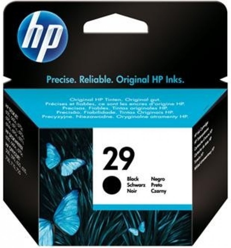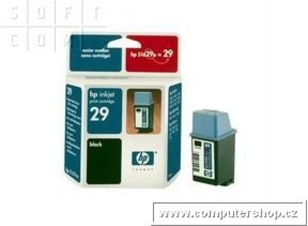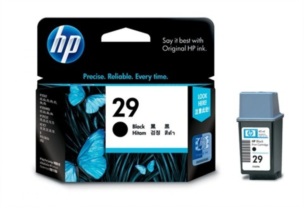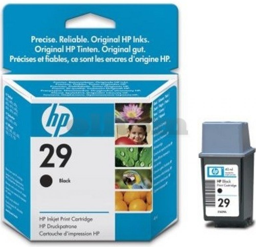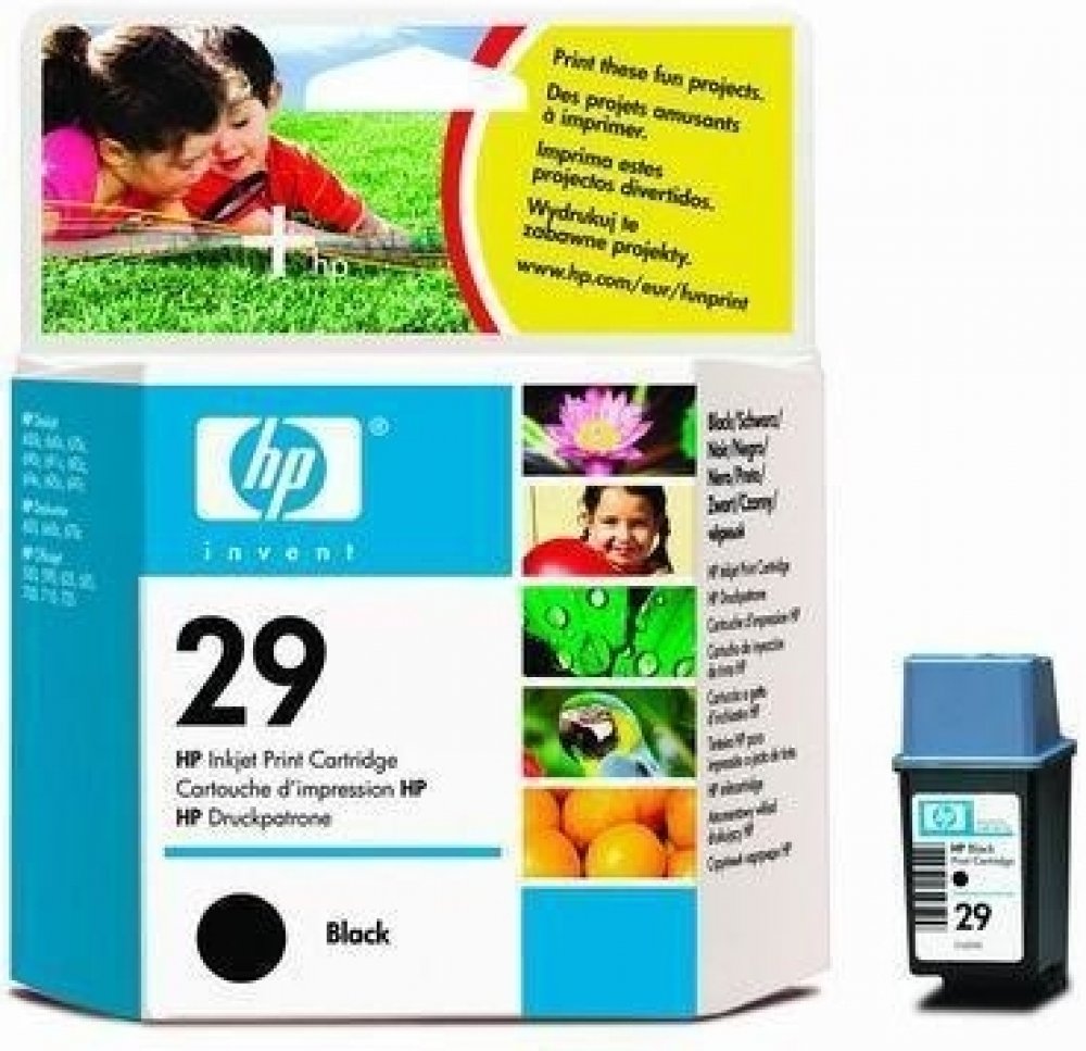 Černá inkoustová tisková kazeta HP 29 (51629A) se svým moderním designem tiskové hlavy a pokrokovou technologií pigmentových inkoustů umožňuje tiskárnám řady HP Deskjet/Deskwriter 600 a HP Officejet vytvářet vynikající černý výstup na libovolné médium.