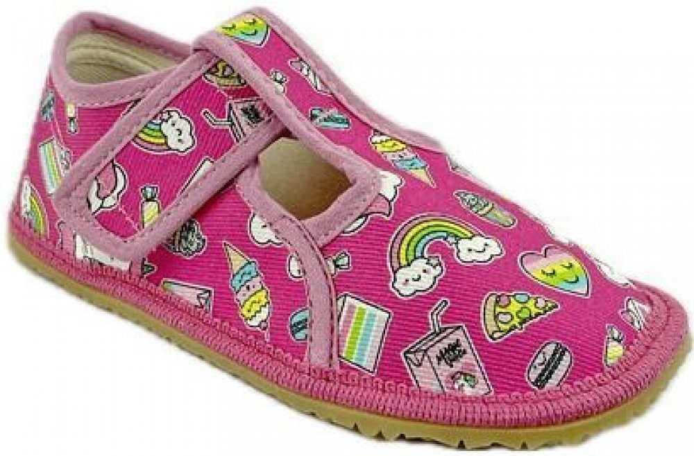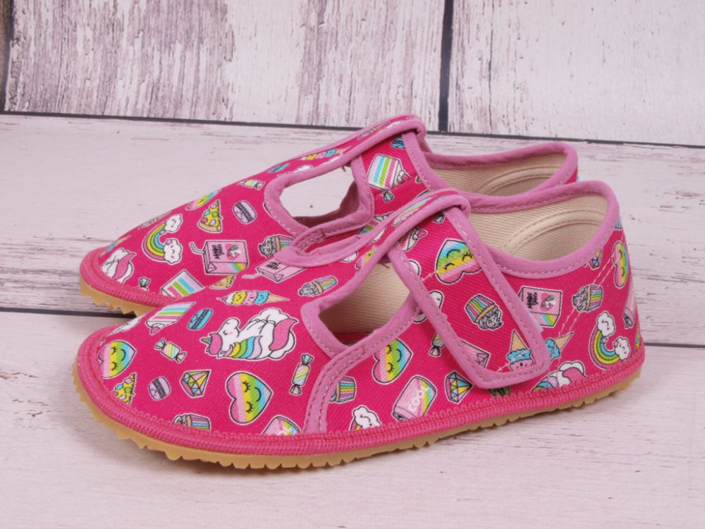 Dívčí textilní přezůvky pro pocit bosé nohy jsou speciálně upravené v prstové části a to zejména v oblasti palce. České bačkůrky s velmi flexibilní podešví umožní pohyb dětského chodidla bez omezení. upozornění - barva RŮŽOVÁ je v různých odstínech a s různými obrázky - výrobce často mění design velikost bačkor je uvedena v centimetrech (tzn. v délce chodidla dítěte) viz. velikostní tabulka vrchní materiál i podšívka: textil podešev: kaučuk o tloušťce 3 mm podešev je protiskluzová pata je díky opatku mírně vyztužená bačkůrky bez podpory klenby obuv je určena pro děti se standardním chodidlem, díky suchému zipu ji mohou nosit i děti se širší nohou a vyšším nártem domácí obuv nelze prát