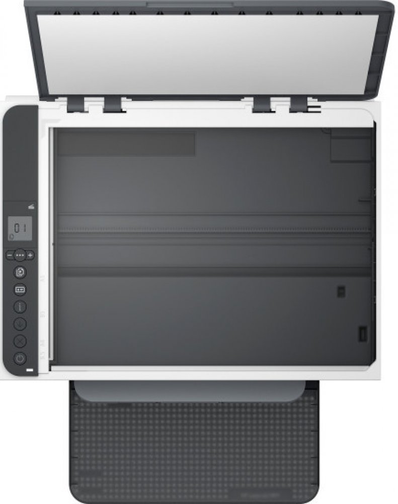 - Displej LCD s ikonami; 3 kontrolky (média, toner, otevřený kryt); 10 tlačítek (Wi-Fi, minus, nabídka, plus, kopírování, kopírování dokladů, informace, pokračování, zrušení, napájení)