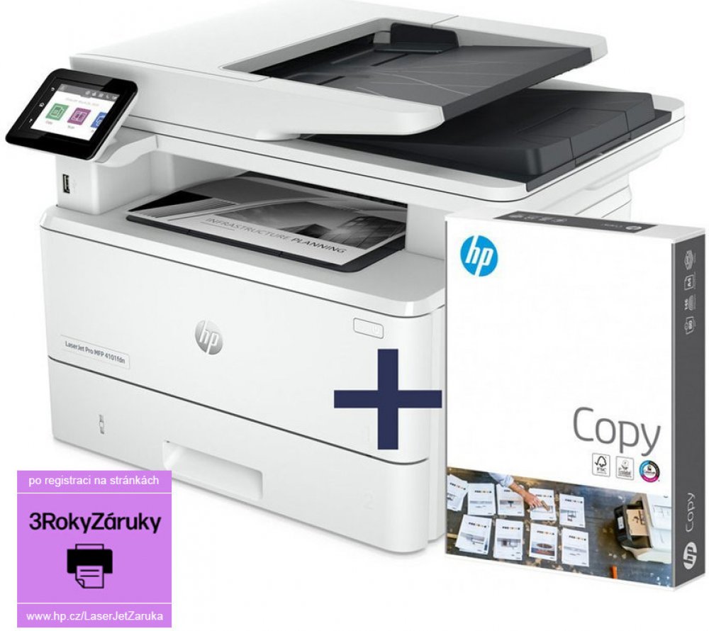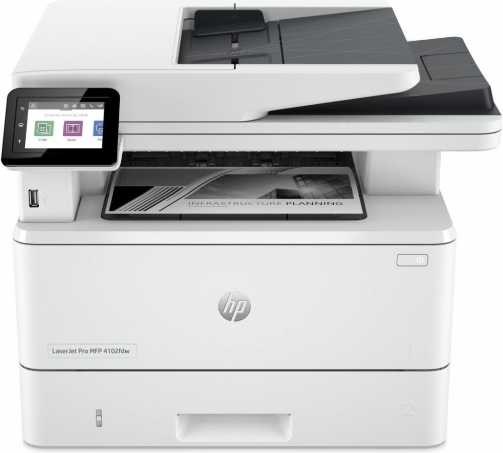 Černobílá laserová tiskárna HP LaserJet Pro MFP 4102fdw se stane ideálním řešením pro kvalitní výstup každodenního tisku ve firmách pro pracovní týmy složené z 3 až 10 lidí, kteří tisknou až 4000 stránek měsíčně, což vyžaduje rychlé provádění úkolů a pokročilé zabezpečení proti hrozbám a podvodům. Ovládá se jednoduše pomocí displeje. Podporuje oboustranný tisk.