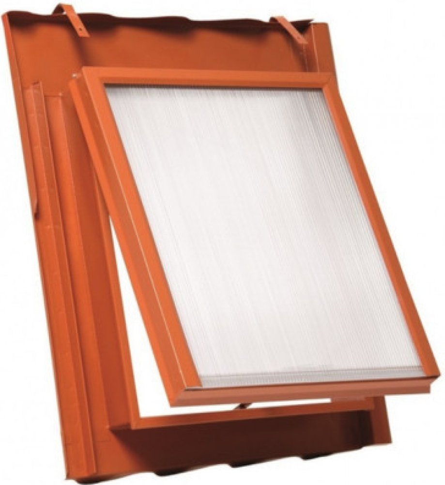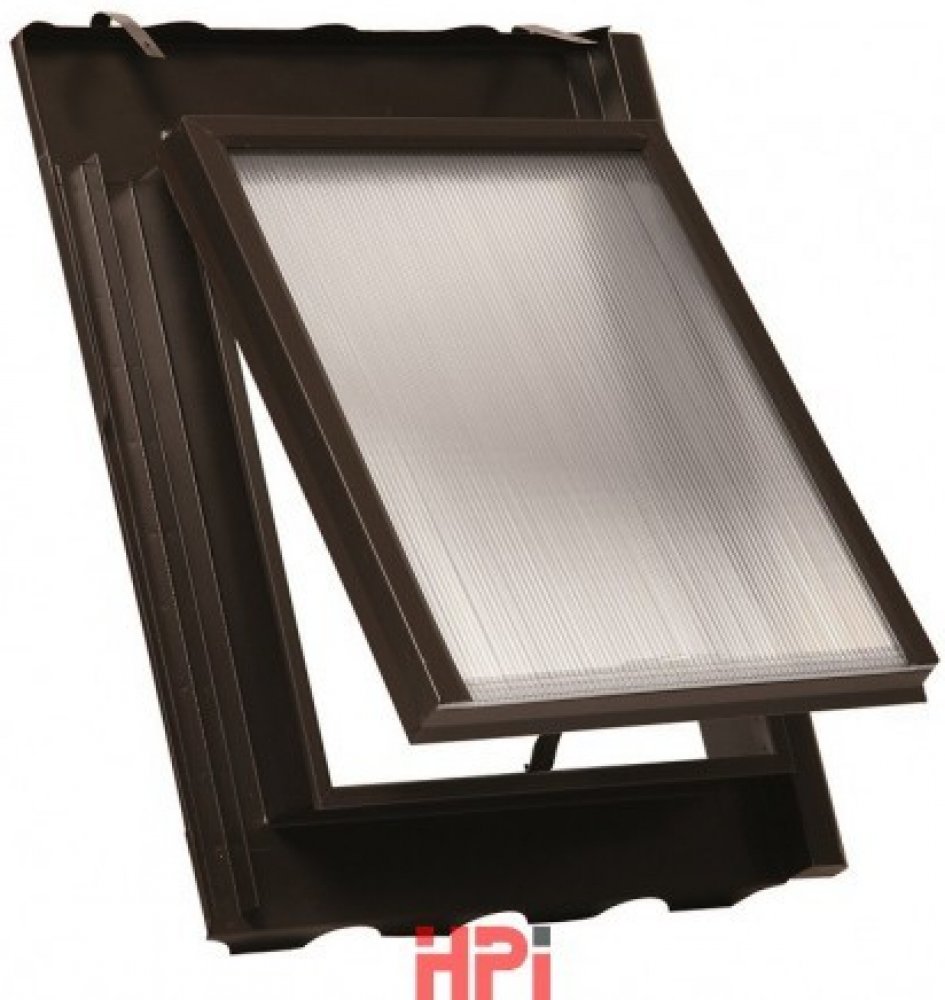 Vikýř je speciálně tvarovaný pro konkrétní typ skládané krytiny což umožňuje přesné usazení do vlny, snadnou a rychlou montáž. Vikýř je speciálně tvarovaný pro konkrétní typ skládané krytiny což umožňuje přesné usazení do vlny, snadnou a rychlou montáž. Vikýř je vyroben z ocelového pozinkovaného plechu. Venkovní rozměr 500 x 600 mm, velikost otvoru 445 x 545 mm. Výplň je z UV stabilního dutinkového polykarbonátu. Sklon střechy 15°-75°.