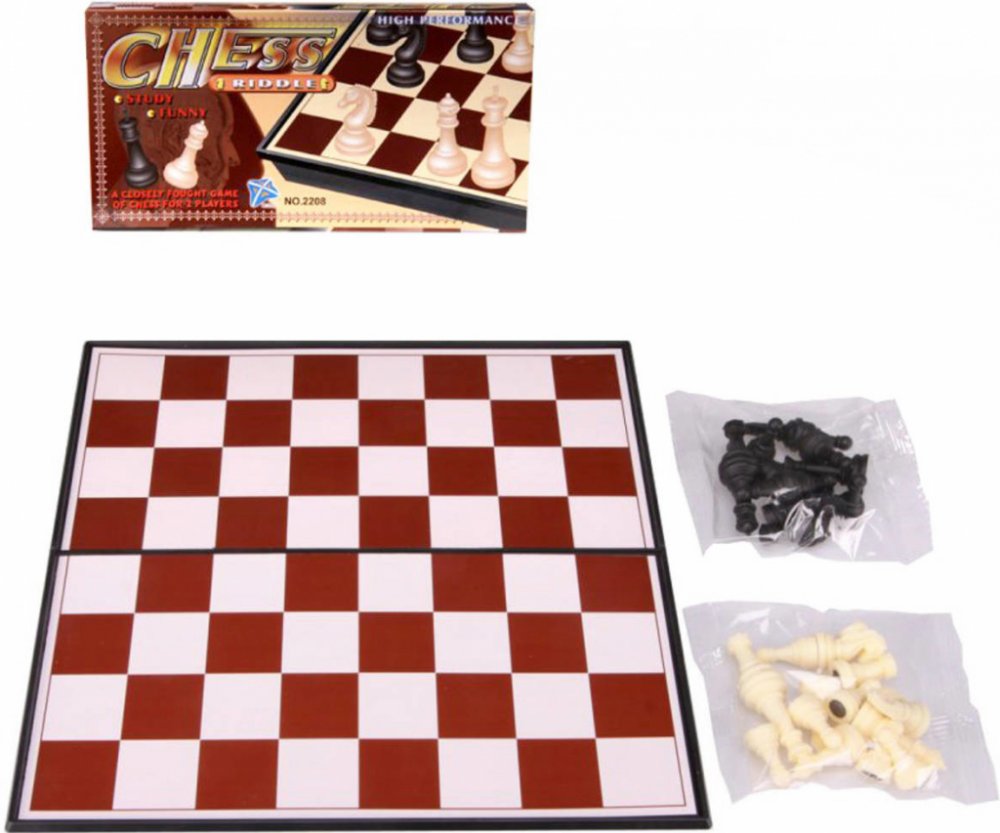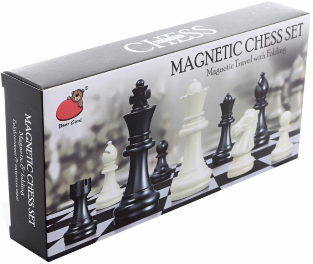 Společenská hra šachy. Cestovní magnetické šachy v rokládacím boxu. Materiál plast. Baleno v krabičce.