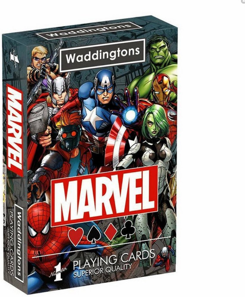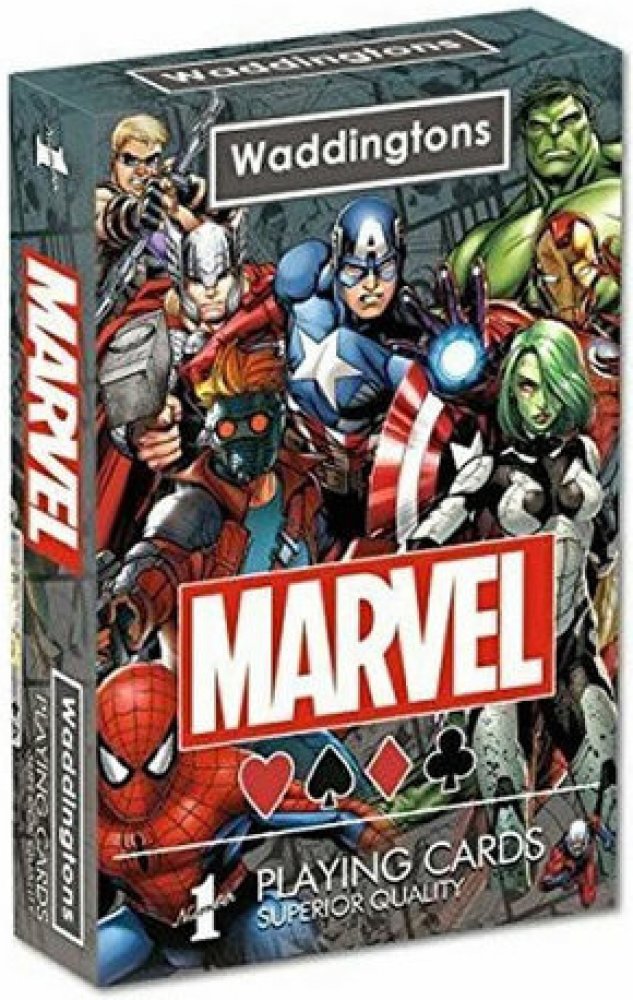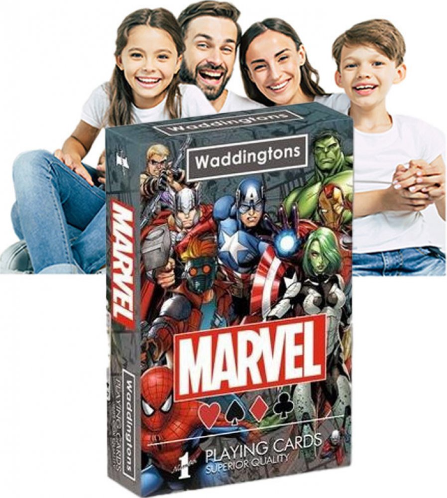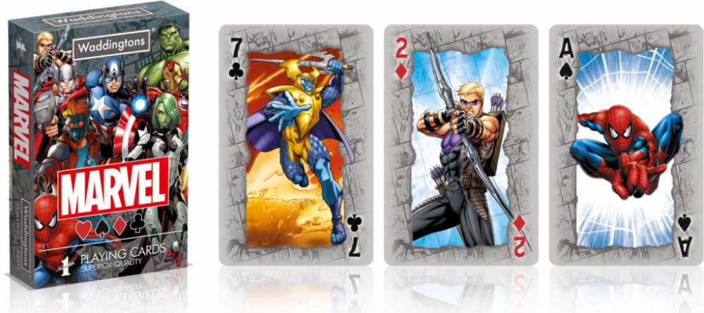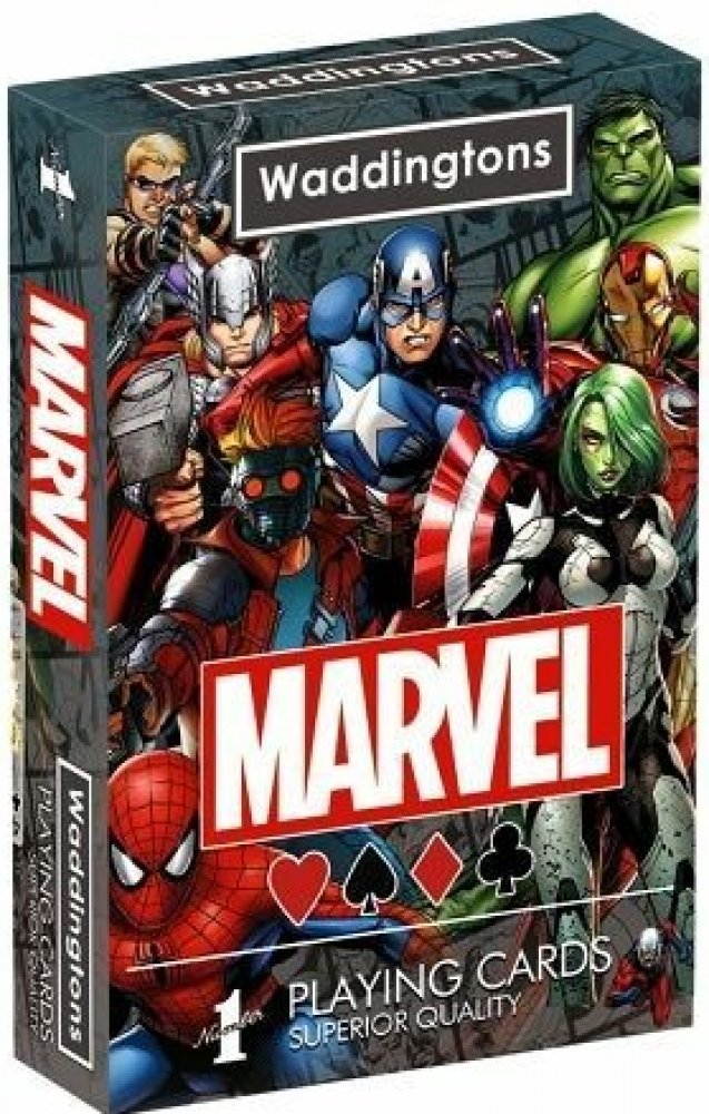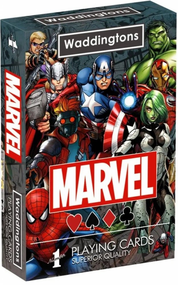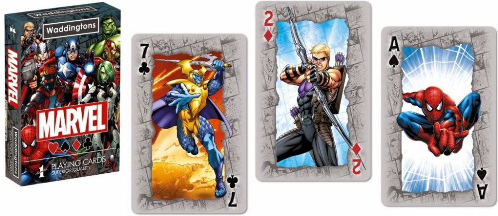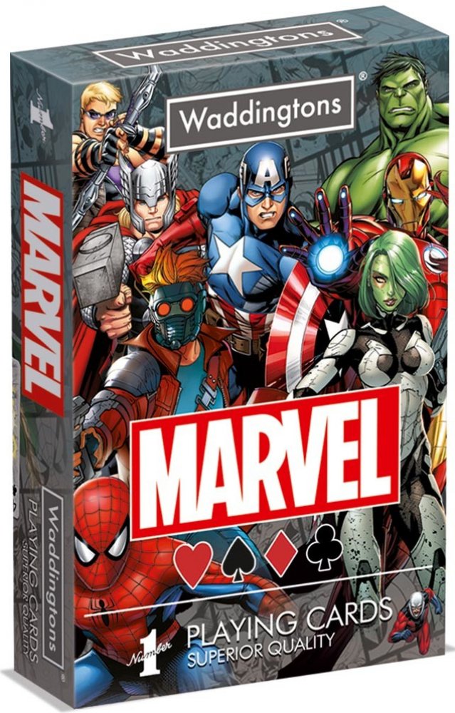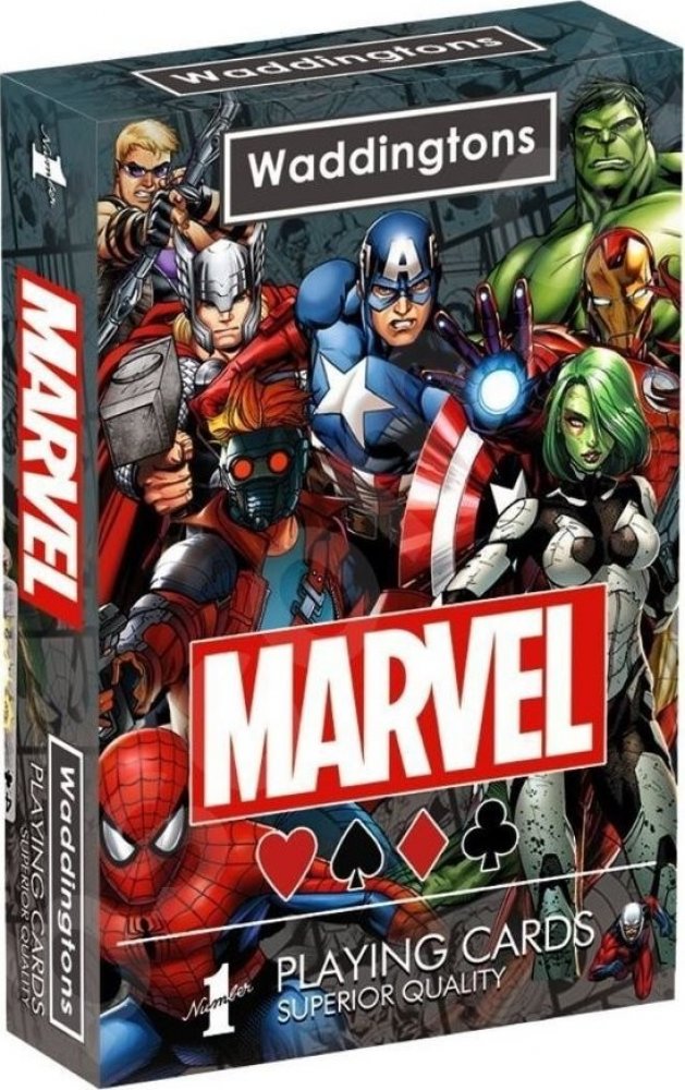 Hrací karty s motivy od Marvel, Winning Moves, WADDINGTONS NO. 1, W030894 Hrací karty s motivem komiksů od populárního vydavatelství Marvel potěší každého fanouška superhrdinů! Spojte s nimi síly a zahrajte si třeba oblíbené karetní hry, jako je hra Kent nebo Pasiáns. Na komiksové obrázky se nebudete moci vynadívat!