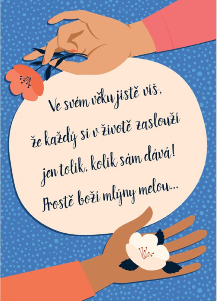 Moderní hrací přání k narozeninám. Po otevření přáníčka začne hrát píseň Boží mlejny melou od Ewy Farne. Moderní hrací přání k narozeninám. Na přední straně je text: "Ve svém věku jistě víš, že každý si v životě zaslouží jen tolik, kolik sám dává! Prostě boží mlýny melou..." Po otevření přáníčka začne hrát píseň Boží mlejny melou od Ewy Farne: Boží mlejny melou, pomalu a jistě, někteří to vědí a další to zjistěj. Boží mlejny melou, to zůstane stejný, léta, věčnost celou, melou boží mlejny! Uvnitř přání je vedle obrázku rukou s květinami text: "...a Ty si proto zasložíš zasypat štěstím! Všechno nejlepší." Rozměry: 155 × 220 mm