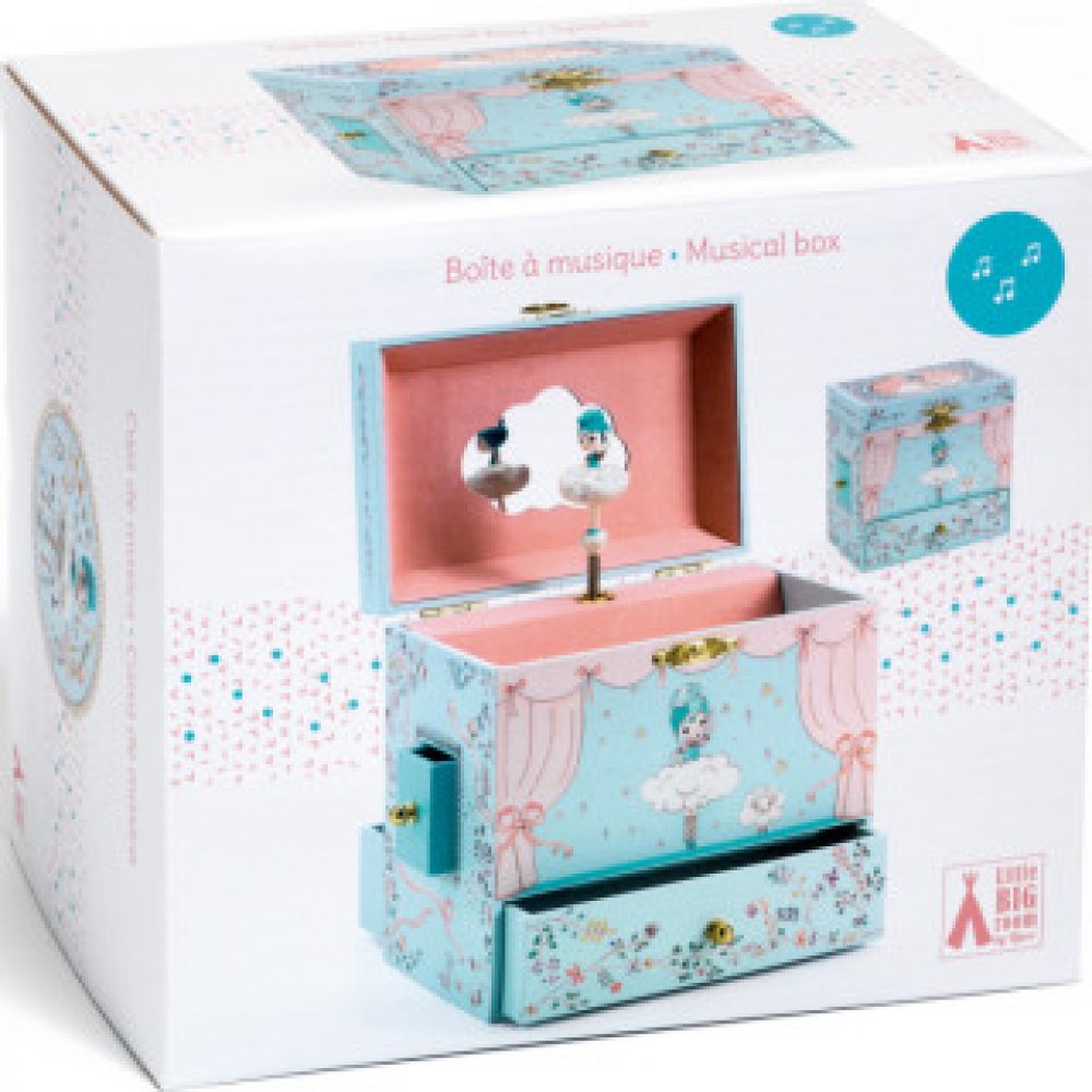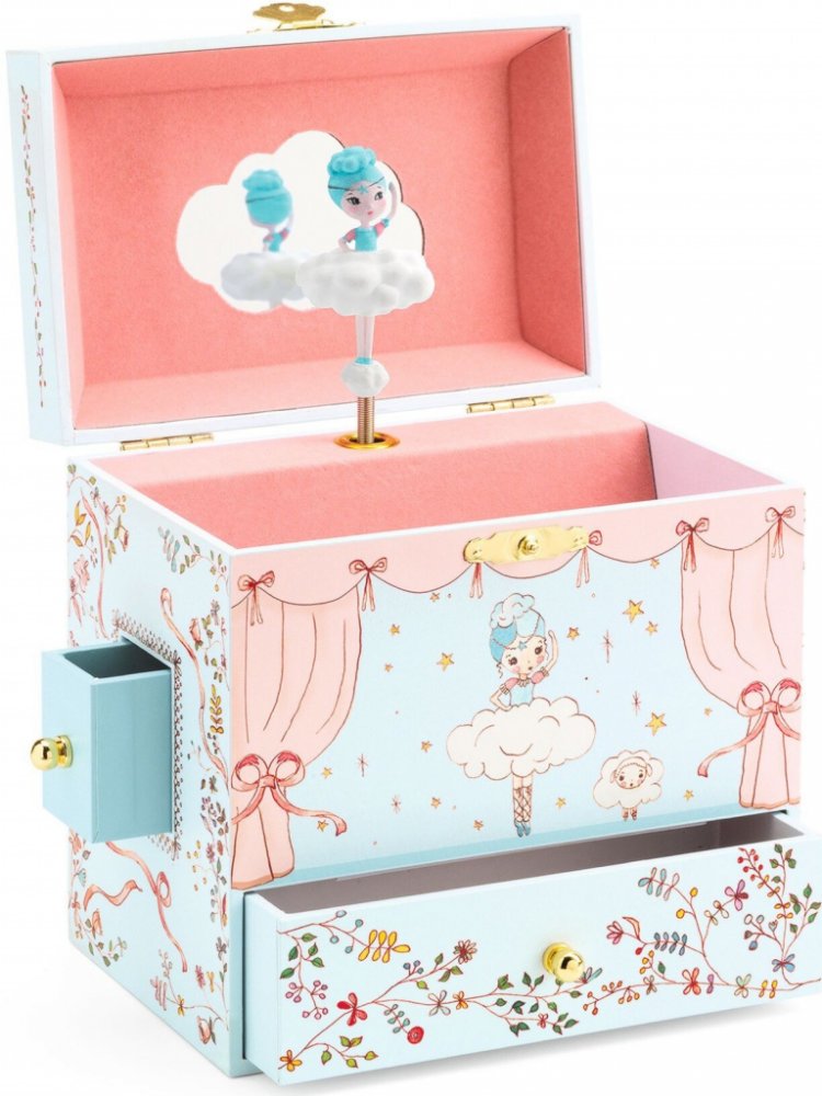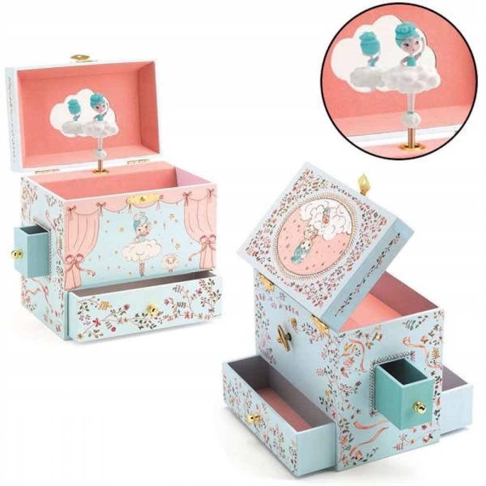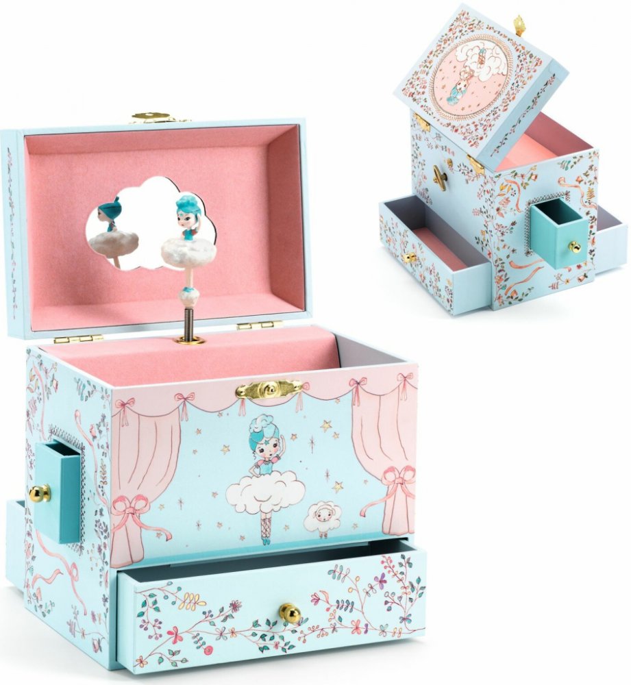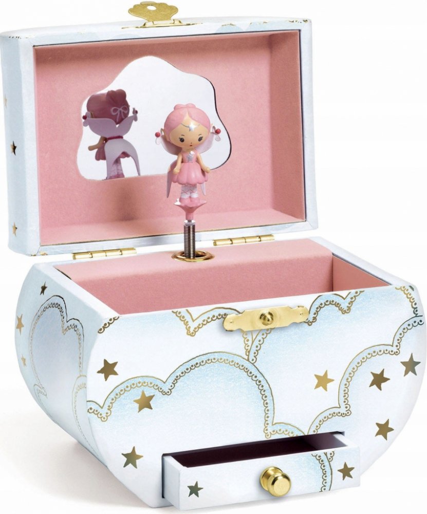Krásně ilustrovaná hrací skříňka se čtyřmi zásuvkami pro uložení šperků a tajemství. Otočte klíčkem, otevřete šperkovnici a vše ožije.