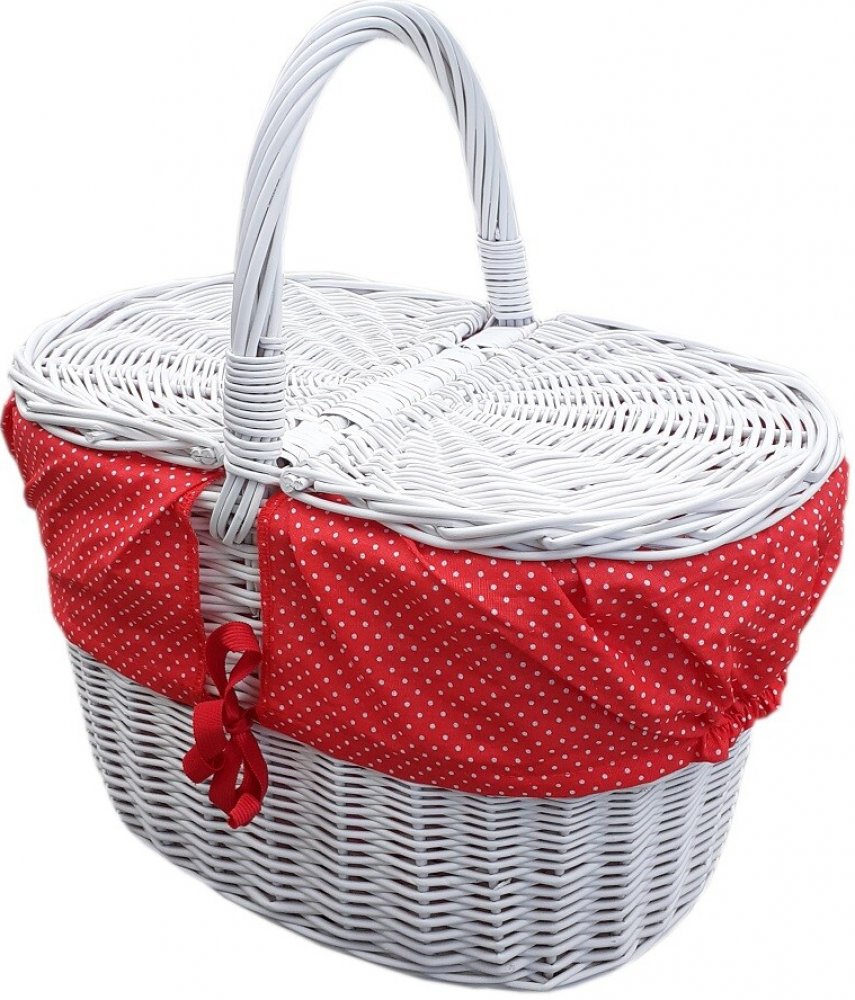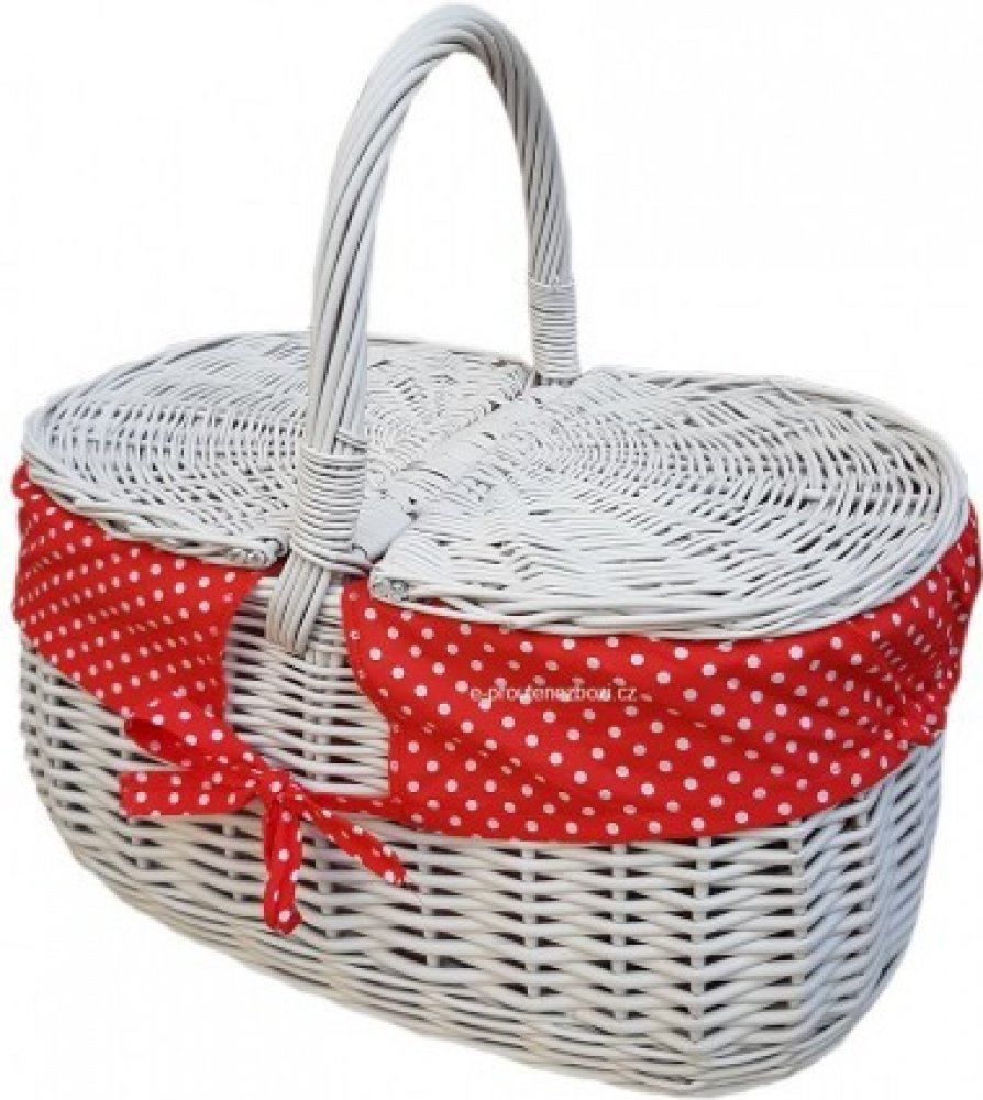 Proutěný bílý piknikový košík s látkou. Košík na piknik, na chatu. Košík je vybaven dvěmi odklápěcími dvířky. Košík je barven kvalitní nezávadnou barvou, vhodnou jak do interiéru tak exteriéru. Barva je atestovaná a vhodná i pro děti. Rozměry: délka 45 cm šířka-hloubka 28cm výška po ucho 42 cm ROZMĚRY a provedení proutí se mohou drobně LIŠIT. Každá výroba proutěného zboží je jedinečná a tak nemůže...