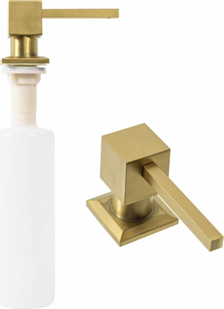 Hranatý dávkovač REA 300 ml k zabudování do dřezu - broušený zlatýPraktický dávkovač na saponát na mytí nádobí nebo mýdla na ruce, který díky univerzálnímu tvaru pasuje na většinu granitových a nerezových dřezů. Dávkovač snadno usadíte do otvorů ve dřezu o průměru 30 až 35 mm, tak aby byla nádoba s kapacitou 300 ml pod povrchem dřezu a na povrchu byla pouze dekorativní pumpička s výlevkou z nerezo...