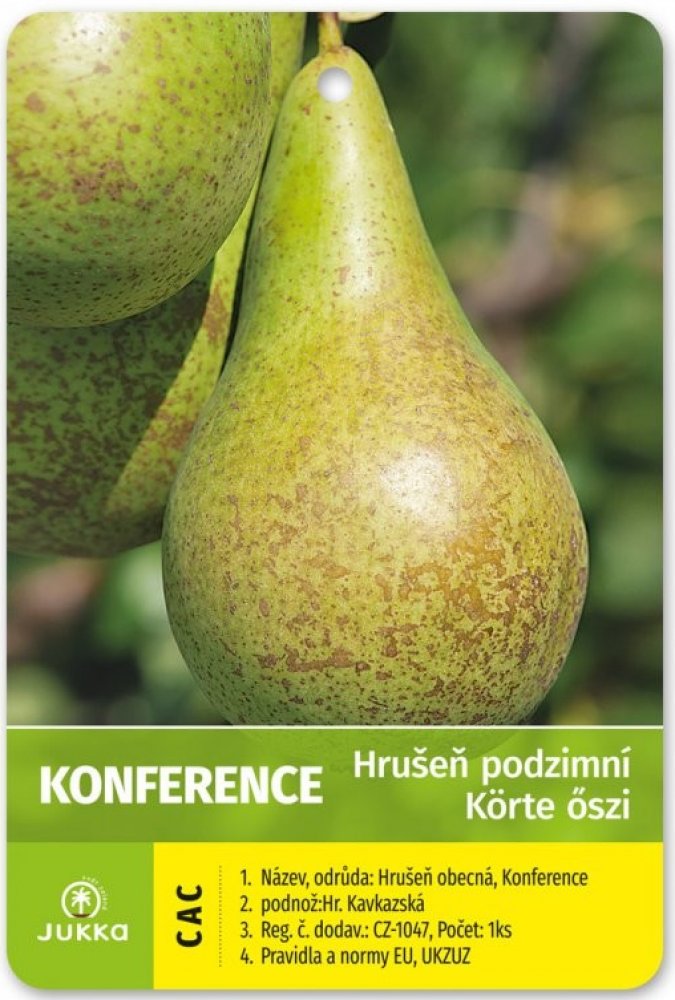 Hrušeň Konference je odrůda vyšlechtěna v Anglii, nenáročná na půdní podmínky i polohu. Sklízí se od poloviny září, plody vydrží měsíc. Plody hrušně Konference jsou středně velké, protáhlého lahvicovitého tvaru, zelenavé s jemnou rzí. Dužina je bílá, sladká a velmi šťavnatá. Odolnost je vysoká proti napadení houbovými chorobami i proti nízkým teplotám. Tato odrůda je vhodná pro transport, konzervaci i pro přímý konzum. Vhodnými opylovači jsou odrůdy Boscova Lahvice, Červencová, Charneuská, Williamsova, Clappova, Madame Verté, Pařížanka.