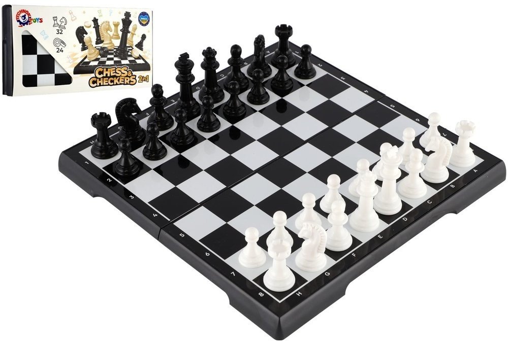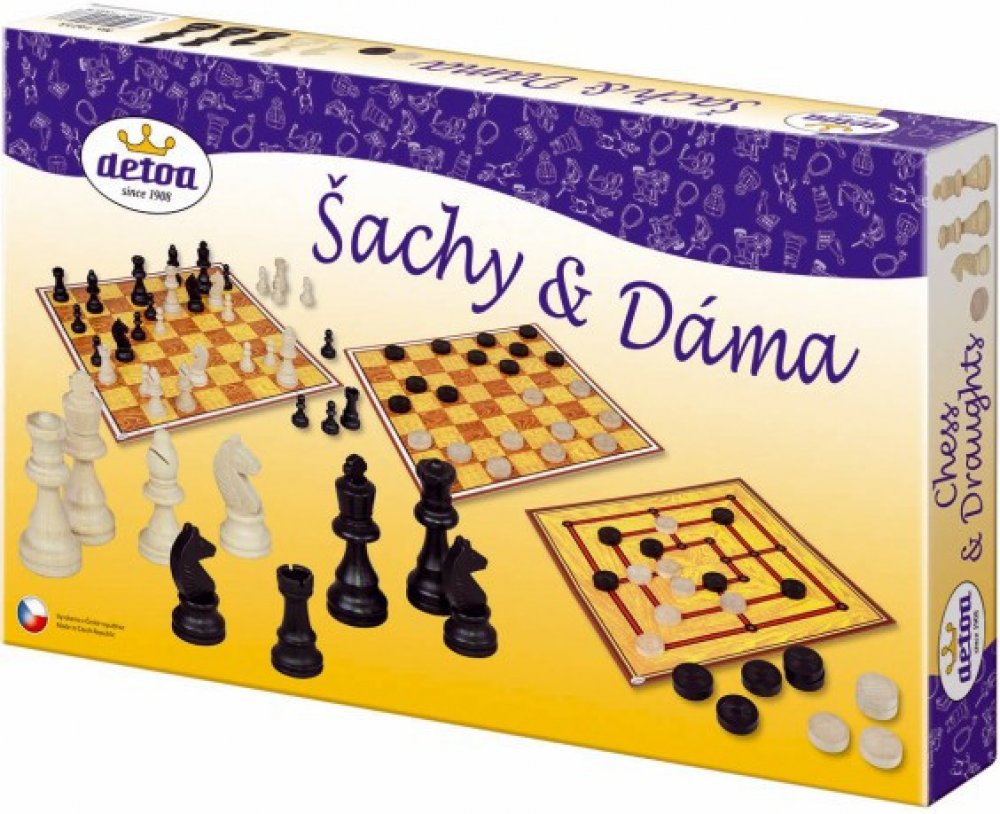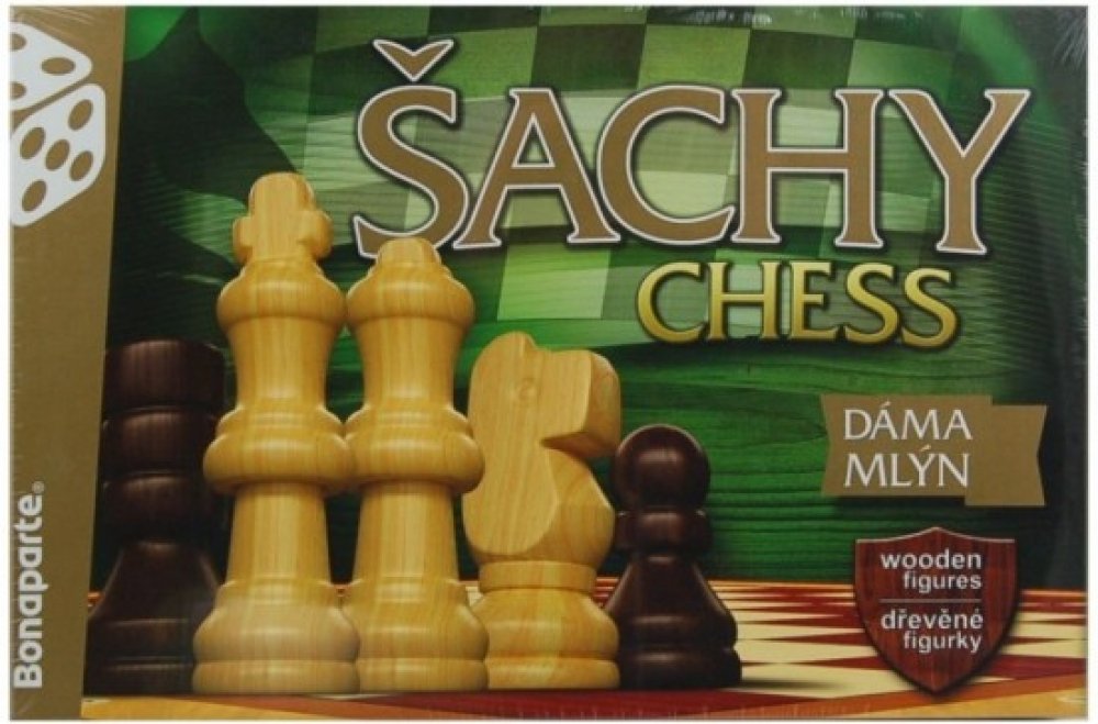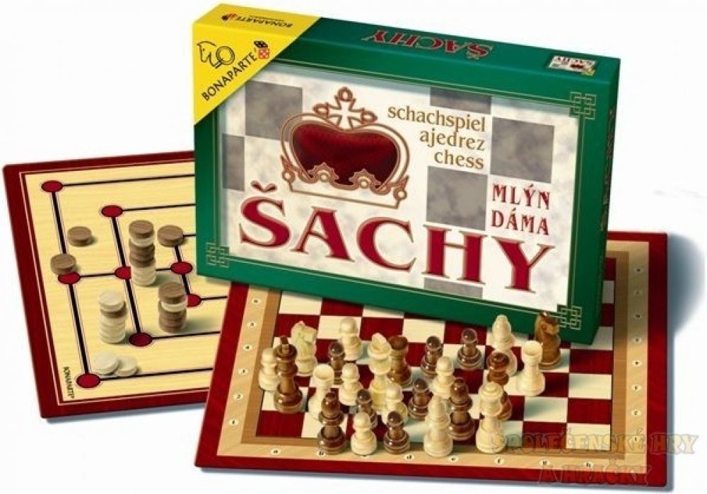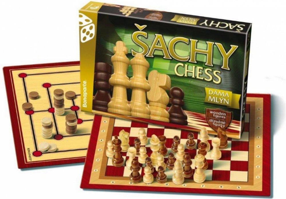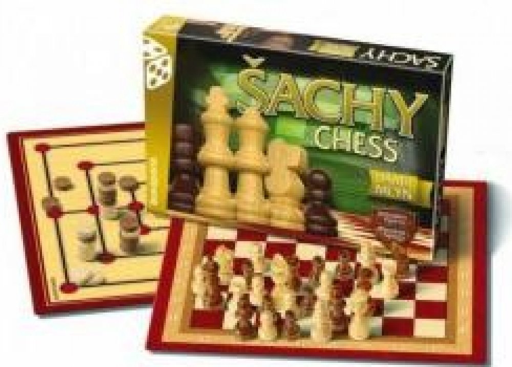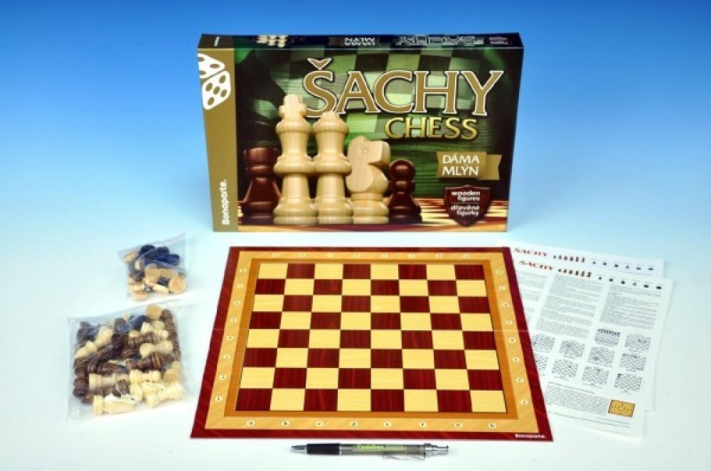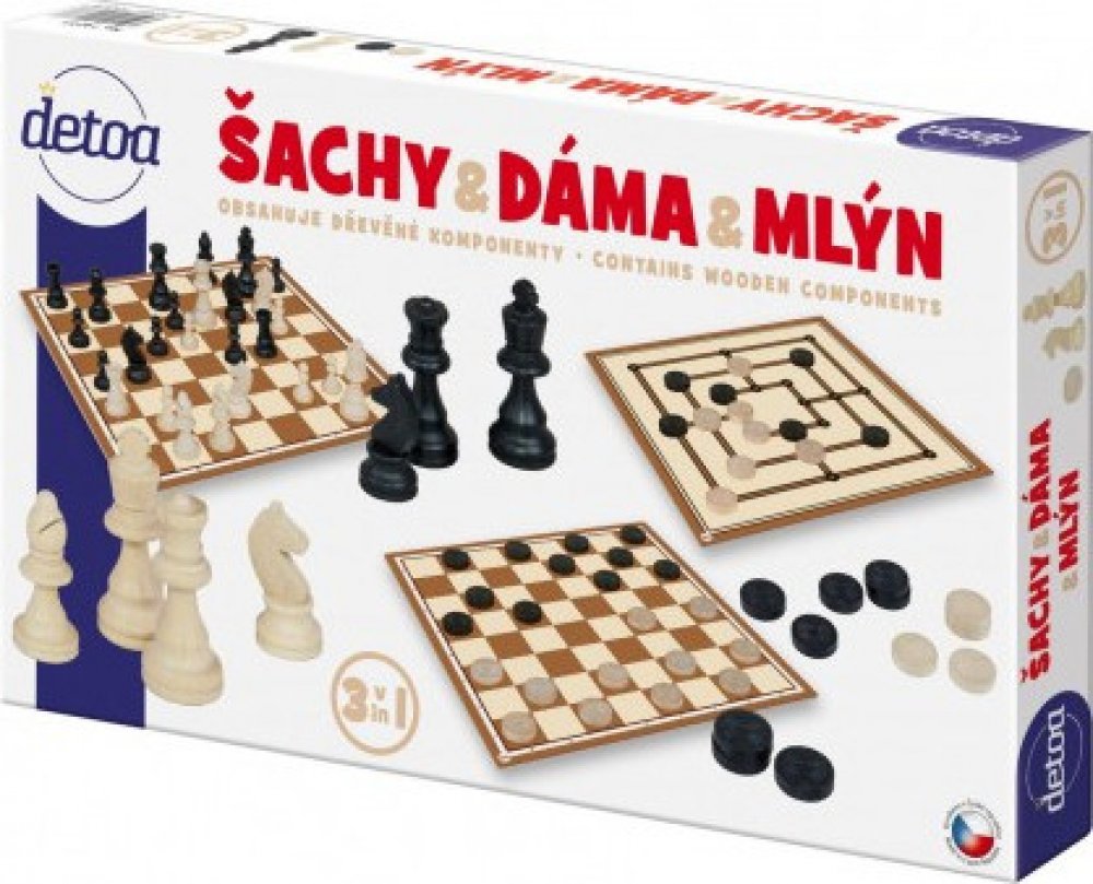Set obsahuje tři oblíbené deskové hry: šachy, dáma, mlýn. Šachové figurky (rozměr krále je 30x74 mm) a dámové kameny (? 30 mm) jsou dřevěné a oboustranný herní plán o rozměrech 330x330 mm je z tvrdého kartonu.