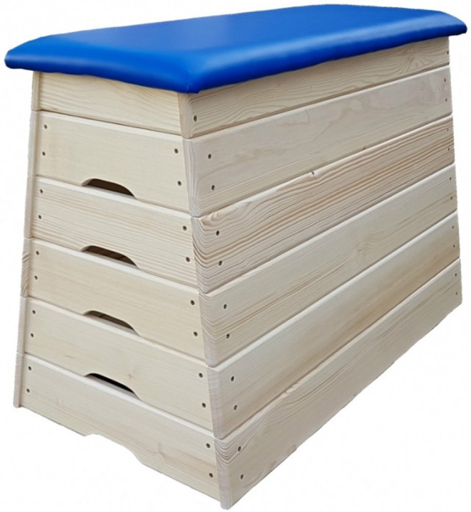 Výška bedny 72 cm, šířka dole 52 cm, nahoře 40 cm, délka 100 cm. Charakteristika výrobku Bedna se skládá z šesti dílu, přičemž jeden je vysoký 12 cm, vrchní díl je čalouněný umělou kůží. Celková výška bedny je 72 cm, která se dá odebíráním dílů postupně snižovat. Jednotlivé díly jsou vyrobeny ze smrkového masivního dřeva, které jsou v rozích pomocví vrutů a lepidla připevněny k bukovým (pro vyšší odolnost) kotevním špalíkům. Pro pohodlné sestavování a přenášení jsou jednotlivé díly opatřeny otvory pro ruce, které jsou v čelech dílů. Povrchová úprava: 3× lakováno transparentním vodou ředitelným lakem od rakouské společnosti Adler. Rozměry: výška bedny 72 cm, šířka dole 52 cm, nahoře 40 cm, délka 100 cm. Hmotnost: 24 kg. Záruční doba: 5 let.