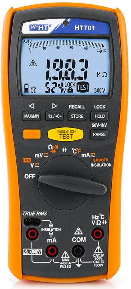 PopisHT701 spojuje funkce testeru izolací (50V/100V/250V/500V/1000V) a plně vybaveného digitálního TrueRMS multimetru v jediném, kompaktním přístroji. Je všestranně použitelný při hledání poruch, preventivní údržbě motorů, generátorů, kabelů nebo rozváděčů. S podsvíceným displejem a integrovanou pamětí pro naměřená data. Přístroj odpovídá IEC/EN 61010-1 v CAT IV 600V a CAT III 1000V.VybaveníCAT IV...