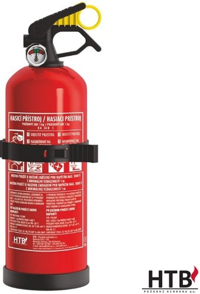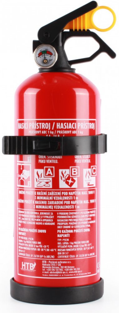 Hasicí přístroj práškový 1kg. Používá se všude tam, kde nesmí dojít k poškození vodou nebo pěnou. Tento hasicí přístroj lze použít k hašení zařízení pod napětím max. do 1000V z minimální vzdálenosti 1 m. Hasicí přístroj je vybaven manometrem a držákem pro snadné uchycení. Třída požáru: A, B, C. Vhodný do osobních automobilů.