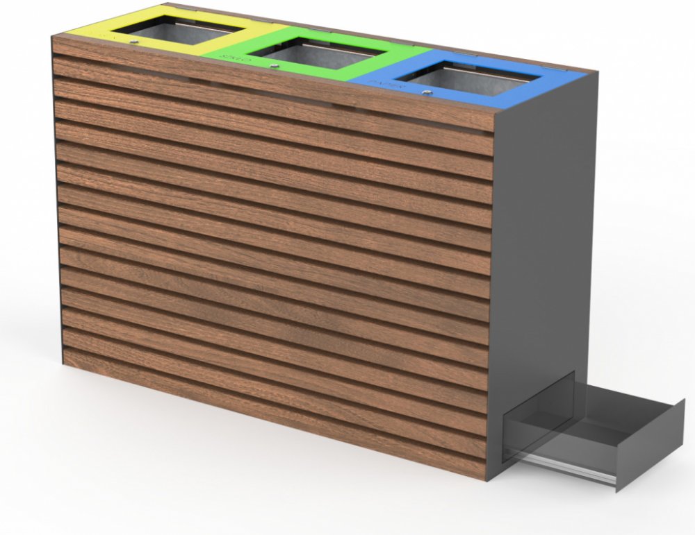 Model KCA033.02 má tři ocelové pozinkované vložky, zámkový mechanismus a funkční zásuvku na spotřební materiál (pytle na odpadky, čisticí prostředky).