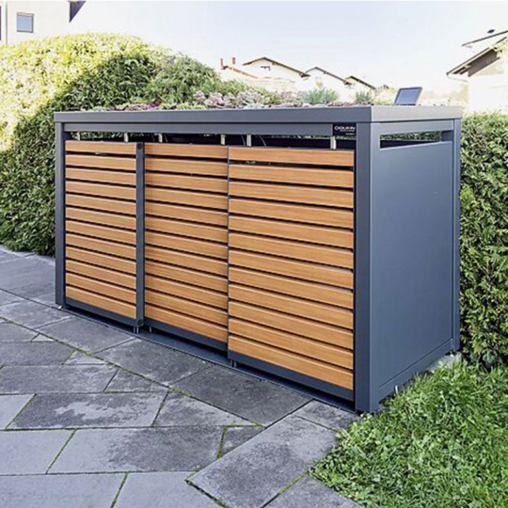 Přístřešek na popelnice Linis s dekorem dřeva ze železa s posuvnými dveřmi. Přístřešky na plastové popelnice (120 l/240 l) od firmy DUKIN jsou vyrobeny z vysoce odolného materiálu. Jsou celokovové, což zaručuje jejich stabilitu a dlouhou životnost. Jsou vybaveny posuvnými dv