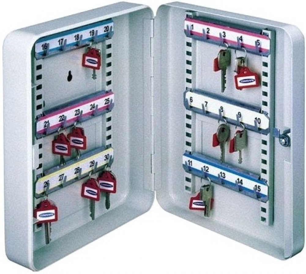 Vyrobeno z kvalitního ocelového plechu.Určeno pro upevnění na stěnu.Opatřeno pochromovaným cylindrickým zámkem s 2 klíči.Lišty na klíče jsou přestavitelné po 10 mm a jsou očíslovány.