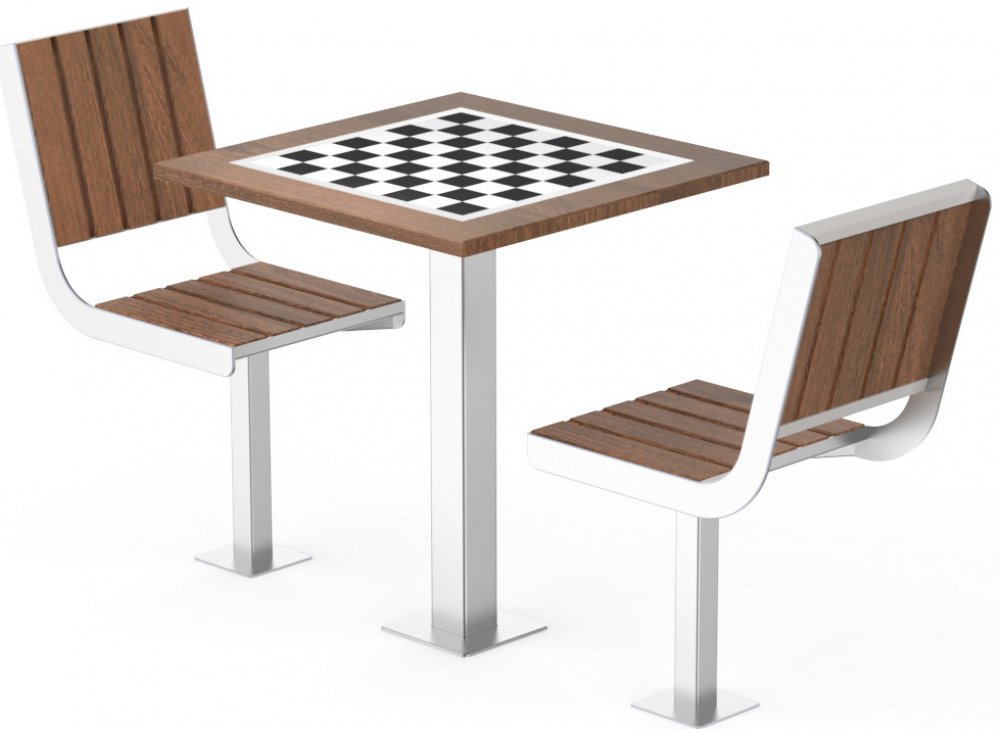 Šachový stůl set TCH110,00. Model TCH110.00 je šachová souprava skládající se ze stolu o šířce 70 cm se šachovnicí a dvou židlí o šířce 60 cm s opěradlem a jednou nohou. Stůl a křesla jsou vyrobeny ze dřeva na ocelové konstrukci.