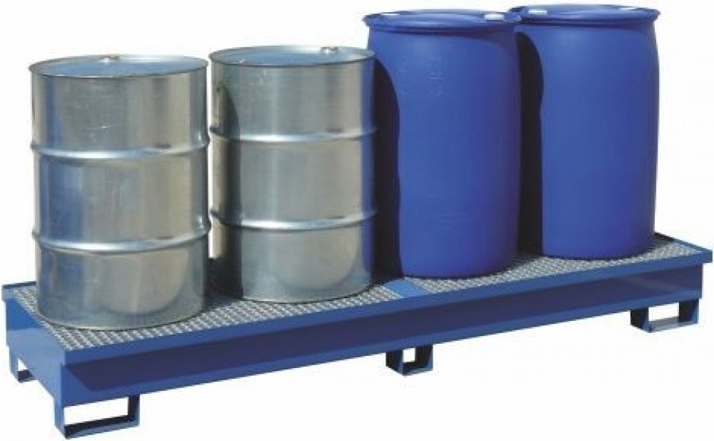 Ocelová lakovaná záchytná vana s žárově zinkovaným roštěm. Záchytná vana pro skladování 4x 200 l sudů v řadě. Provedení s roštem usnadňuje manipulaci se sudy. Vybaveno kapsami pro manipulaci pomocí VZV techniky. Záchytná vana musí být při manipulaci VZV v prázdném stavu.