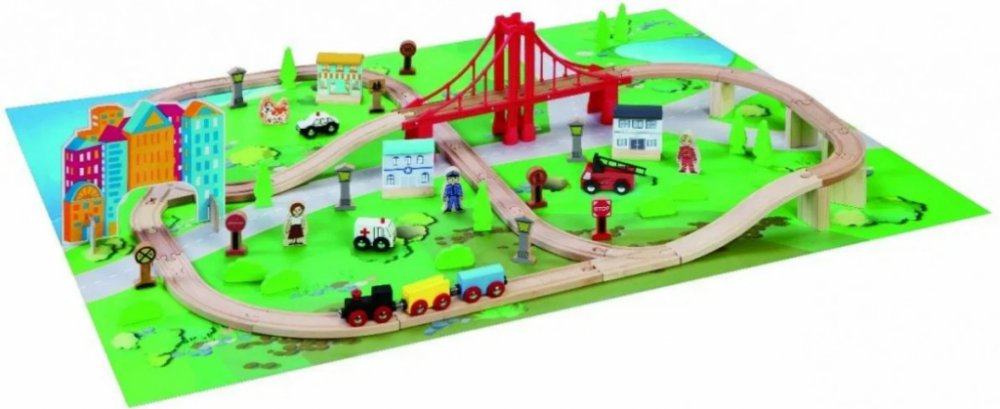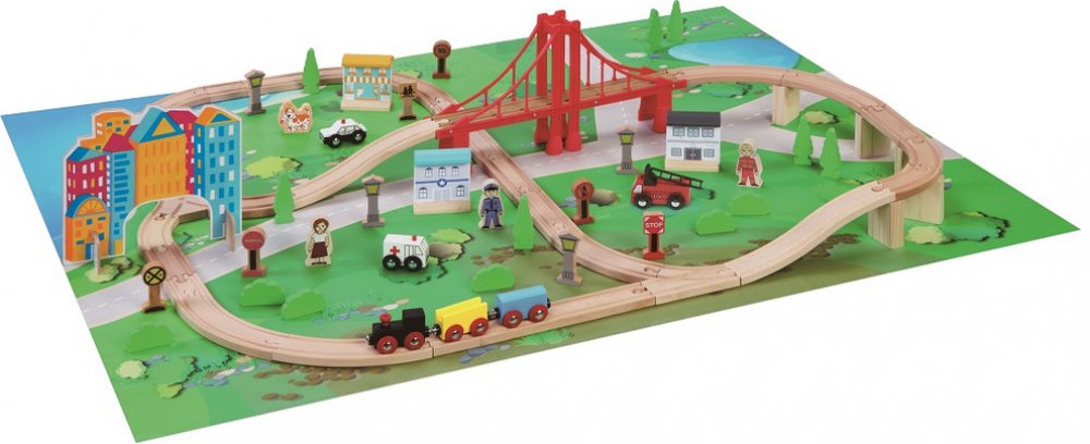 Vláčkodráha - Přímořské město 80 ks Kdo z nás by se čas od času nechtěl přenést do světa dětí, ve kterém nejsou žádná pravidla a dá se tvořit a hrát si podle vlastních představ. Přesně to je možné s touto báječnou vláčkodráhou, která dětem ukáže, že je s ní možné prakticky všechno, co je napadne. Kompatibilní a velmi kvalitní Vláčkodráha je kompatibilní s dalšími vláčkodráhami na trhu. Tento set je opravdu velký, jelikož obsahuje 80 dílů, ale i tak ho můžete ještě snadno rozšířit. V balení najdete koleje, vláčky a mnoho dalších doplňků, to vše vyrobené z velmi kvalitního dřeva. Bohatá výbava Stavebnice obsahuje podložku z tvrdého papíru, 1x visutý most, 7x dlouhou kruhovou kolej, 6x krátkou kruhovou kolej, 3x 5 cm rovnou kolej, 5x 10 cm rovnou kolej, 1x 8 cm rovnou kolej, 2x 20 cm rovnou kolej, 2x nadjezdovou kolej, 2x výhybku, 5x podpěrný blok, tunel ve tvaru města, lokomotivu + 2x vagonek, 3x auto, stromy, keře, lampy, značky, postavičky a domky. Specifikace: Ideální hračka pro rozvoj motoriky, představivosti, kreativity a fantazie Vyrobeno z kvalitního dřeva Plně kompatibilní s dalšími vláčkodráhami Vhodné pro děti od 3 let, obsahuje malé části Rozměry balení cca 44 x 31 x 7,5 cm Rozměr sestavené stavebnice: 112 x 87 cm