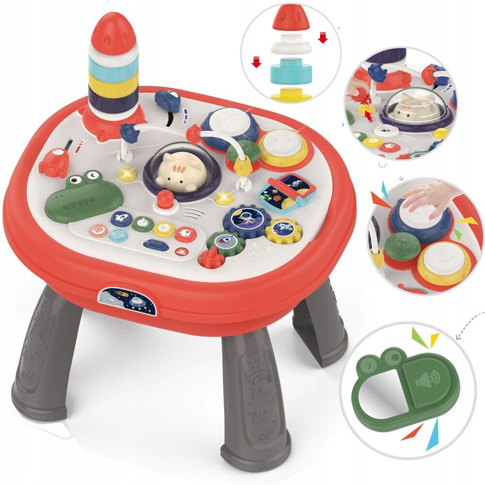 Na stole jsoubarevná tlačítka s vesmírnou grafikou, které zahrnují různéveselé melodie, hudba a zábavné zvuky.