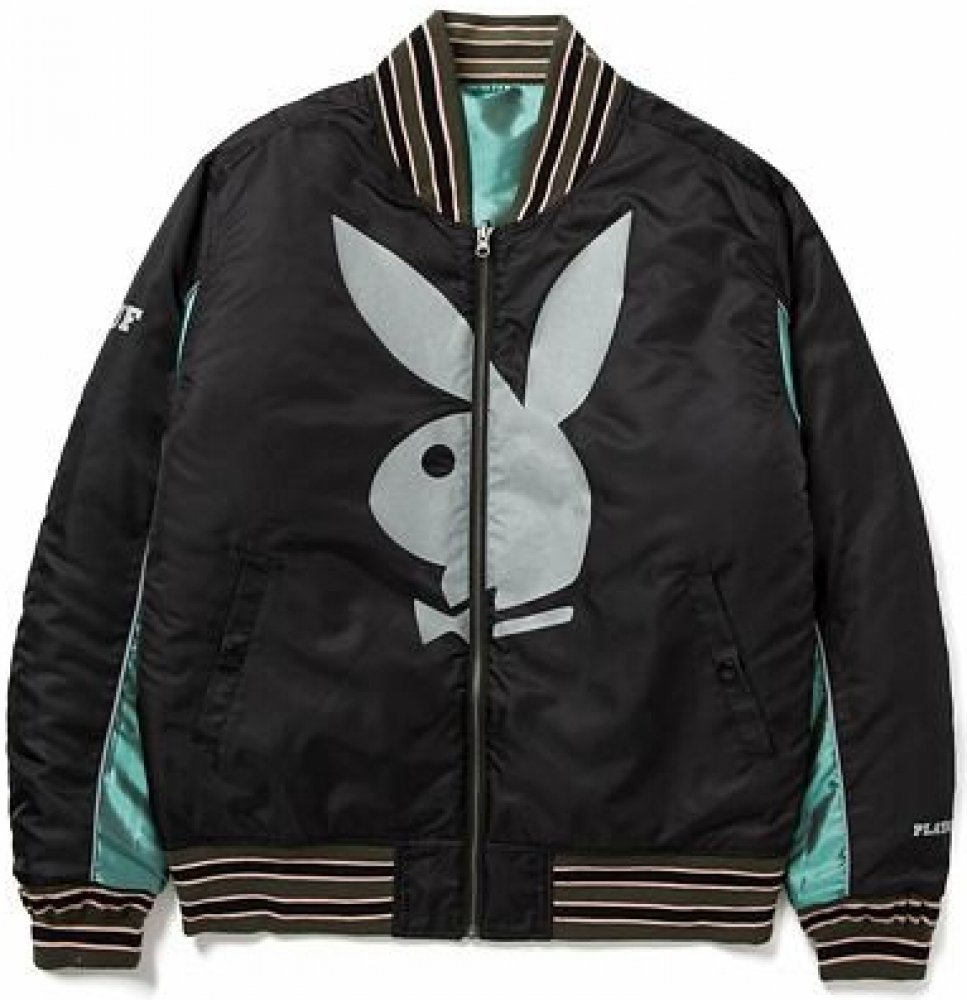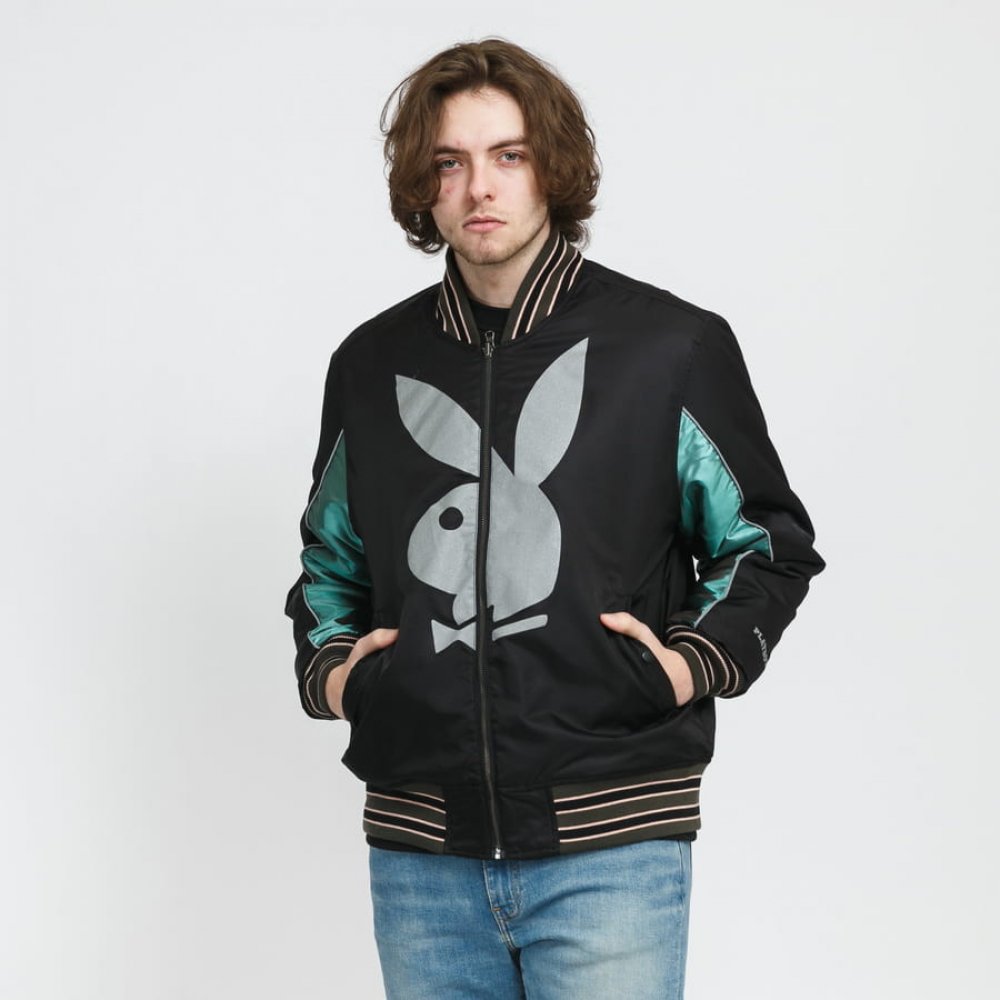 Pánská bomber bunda od značky HUF z kolaborace s Playboy s logem na hrudi . bunda oboustranná kapsy na ruce zapínání na zip elastické manžety a lem logo na hrudi Focena velikost L. Model měří 186 cm a váží 78 kg.
