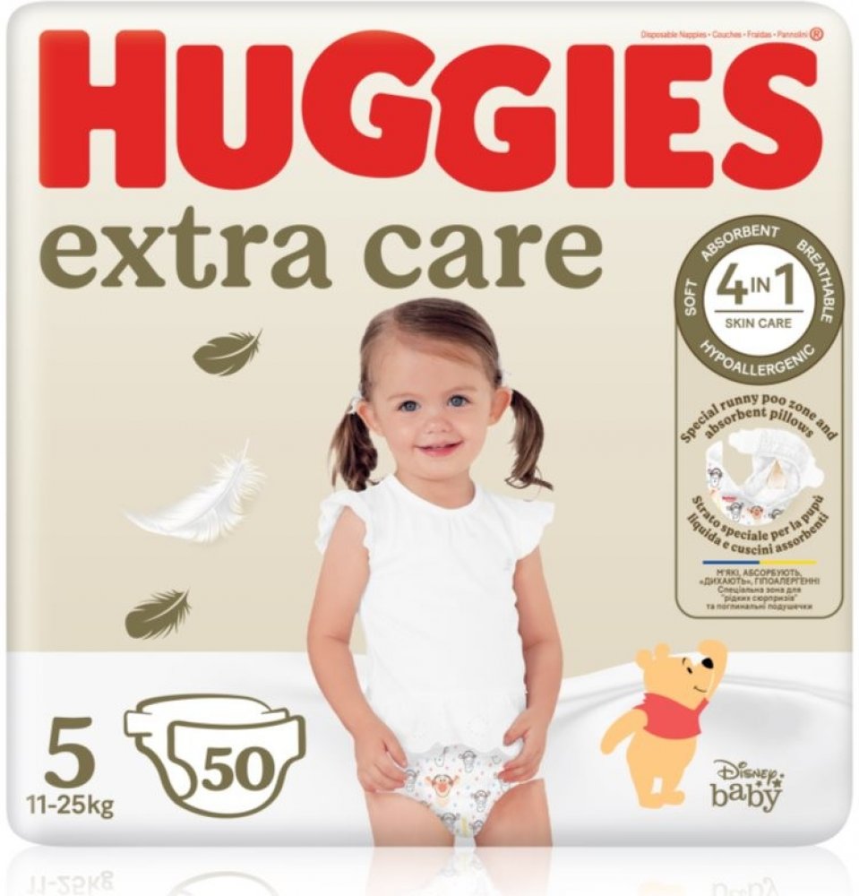 Huggies Extra Care Size 5, 50 ks, Jednorázové pleny pro děti, Miminko, které je v suchu, je šťastné miminko. Komfort po celý den i noc zajistí vašemu děťátku jednorázové pleny Huggies Extra Care Size 5. Udrží jeho zadeček v suchu a vy si tak můžete naplno a bez obav užívat každou společnou chvilku. Vlastnosti: propouští čerstvý vzduch dovnitř a vlhký ven hypoalergenní rychlá absorpce pro pocit sucha hebká povrchová vrstva pro maximální pohodlí a spokojenost dítěte několik absorpčních kanálů pro rychlý odvod vlhkosti tvar přizpůsobený tělu dítěte indikátor vlhkosti upozorní, kdy je třeba plenku vyměnit