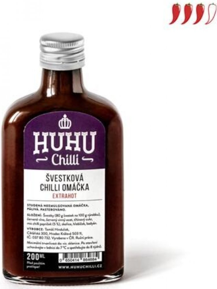 Tato švestková chilli omáčka vás opravdu příjemně překvapí sladěním chutí sladkého ovoce a jemně pikantních chilli papriček. Plná chuť sladkých švestek z ovocného sadu v Pasohlávkách v kombinaci s jemnými chilli papričkami a doladěná červeným vínem – to je božská kombinace, která vám zaručí slast na jazyku. Podle slov výrobce jsou tyto švestky v (polo)tekuté podobě ostřejší než slivovice, s vychytanou chutí inspirovanou tradičními českými povidly Použití: k jakékoliv úpravě masa, klobásám, tvrdým sýrům, tofu apod. Skladování Skladujte na suchém a chladném místě, mimo sluneční svit. Složení Švestky (80 g na 100 g výrobku), červené víno, červený vinný ocet, třtinový cukr, mix chilli papriček (nad 500k SHU) 5 %, skořice, hřebíček, badyán.