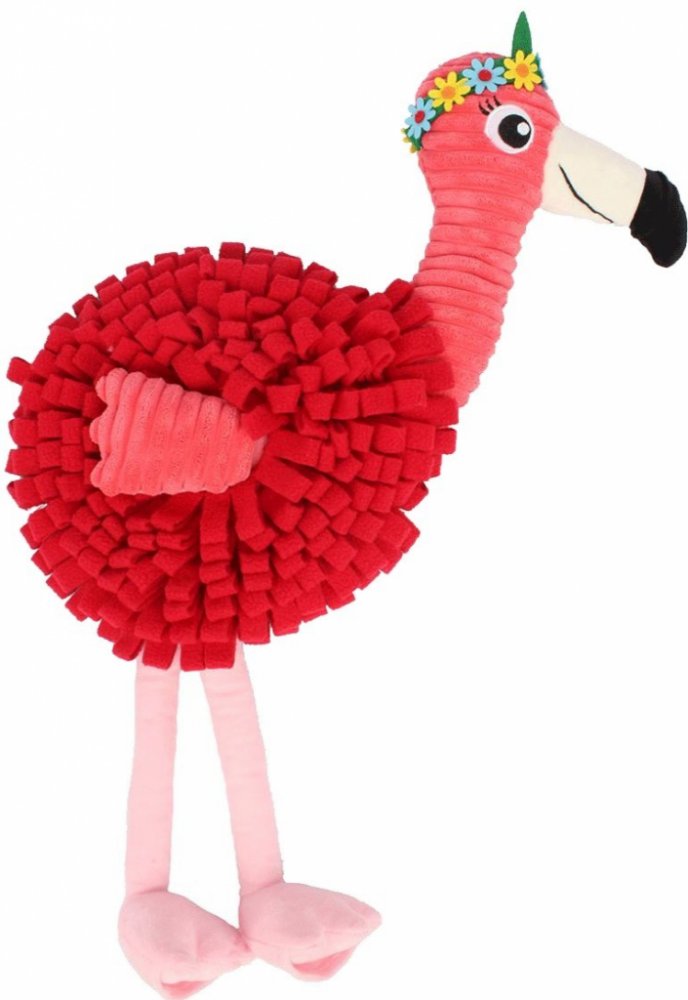 Huhubamboo čichací plameňák je interaktivní plyšová hračka pro psy nebo kočky. Obyčejná plyšová hračka je skombinovaná s praktickou čichací podložkou. Tělo plameňáka je totiž vytvořeno ze střapců, kde se dají ukrývat pamlsky. Hračka tak funguje nejen jako interaktivní hračka, ale také jako pomůcka proti hltaní a rychlému polykání. Do hračky mezi střapce nasypete pár pamlsků nebo granulí a čichací hra s odměnou pro vašeho mazlíčka může začít. Zpomalený příjem potravy redukuje významným způsobem nadýmání a špatné trávení. Všestranná hračka pro zabavení a hru spojenou s jídlem. Uvnitř hračky se nachází šustivý papír pro šustivý efekt a větší zaujetí vašeho mazlíčka. Rozměry: 57 cm x 34 cm x 6 cm. Materiál: 100% polyester. Upozornění: Dbejte na to, aby vaše zvíře nesnědlo žádnou část hračky, mohlo by to mít nepříjemné následky. Upozornění: Dbejte na to, aby vaše zvíře nesnědlo žádnou část hračky, mohlo by to mít nepříjemné následky. Není hračka pro děti. Určeno pouze pro psy.