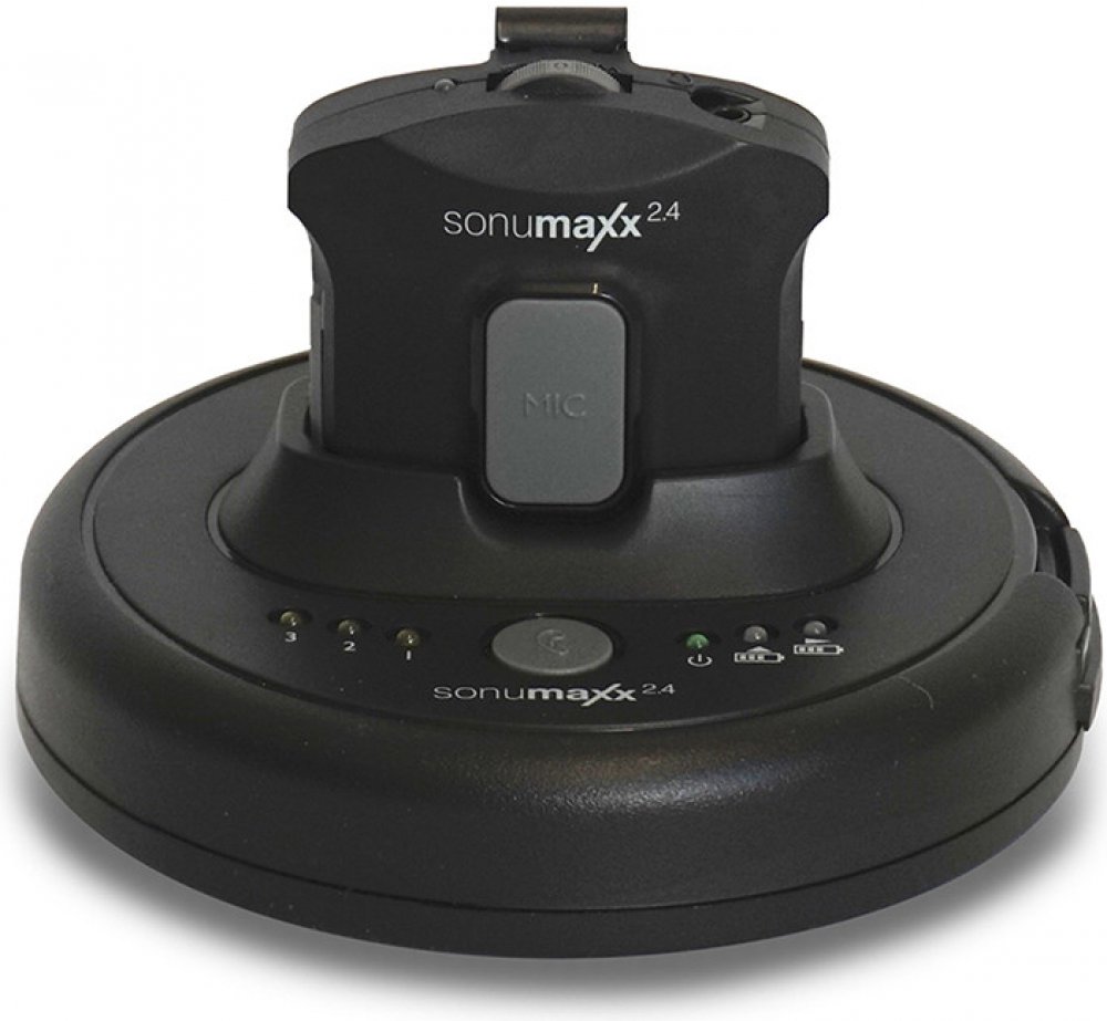 Bezdrátová sluchátka pro nedoslýchavé a seniory Humantechnik Sonumaxx 2.4 pro zesílení zvuku televize, DVD, rádia apod. až na 120 dB. S funkcí hlasitého odposlechu pro zesílení zvuku z okolí, univerzální přijímač pro připojení sluchátek nebo indukční smyčky.