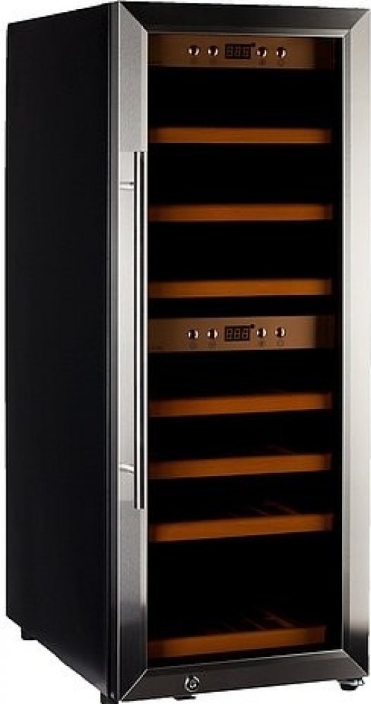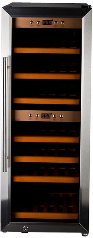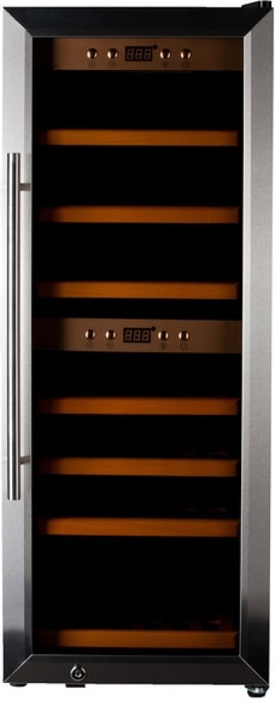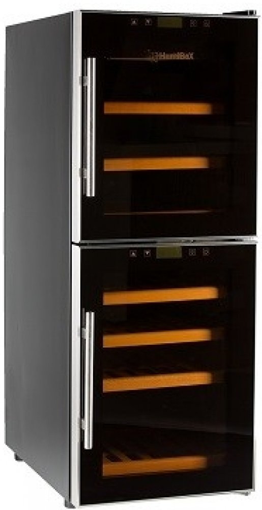 Skvělá dvouzónová kompresorová vinotéka značky HumiBox s kapacitou 38 lahví. Celému designu dominují nerezová dvířka, samozřejmostí jsou dřevěné výsuvné pozice, led podsvícení a samostatná regulace každé zóny. Hlavní předností této vinotéky je nízká spotřeba (0,74kW/24 hodin) a vysoký chladící výkon oproti termočlánkovým vinotékám!