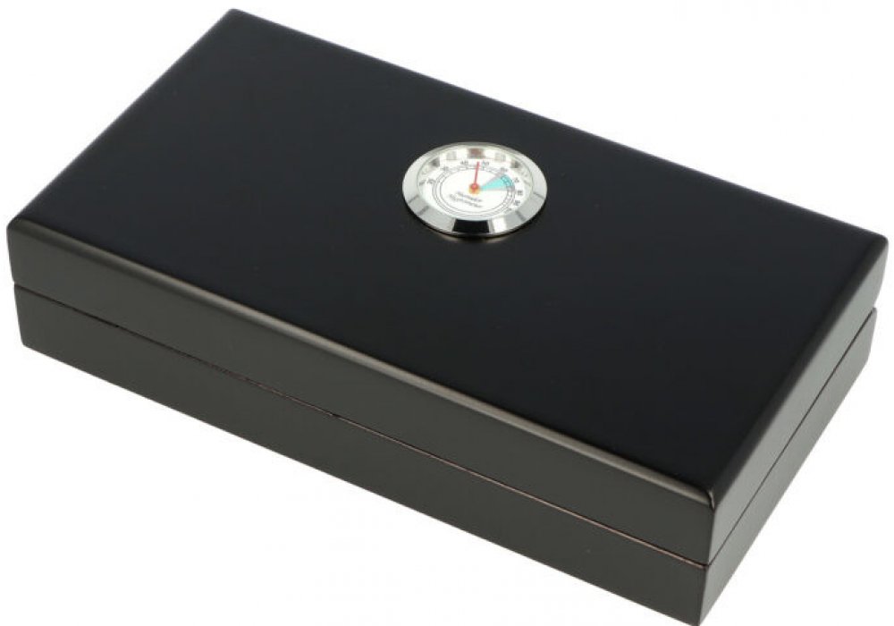 Cestovní humidor na doutníky Angelo s kapacitou cca 5 doutníků (v závislosti na velikosti). Malý praktický humidor vhodný při převážení doutníků na cestách. Humidor v černém matném provedení je vybavený zvlhčovačem s houbou a výměnným analogovým vlhkoměrem, který je zasunutý v otvoru ve víku. Zvlhčovač se uchycuje humidoru oboustrannou lepenkou se suchým zipem.